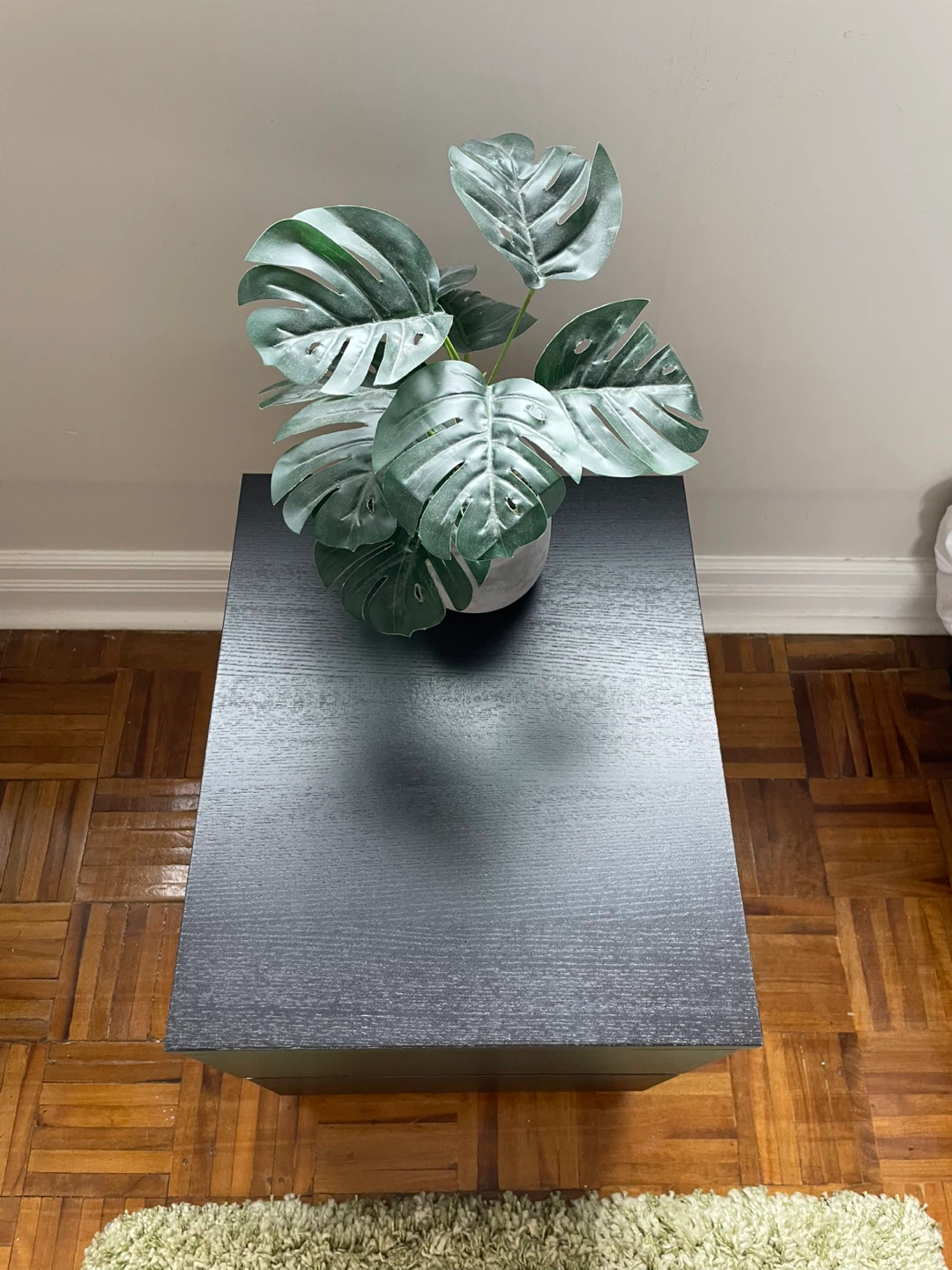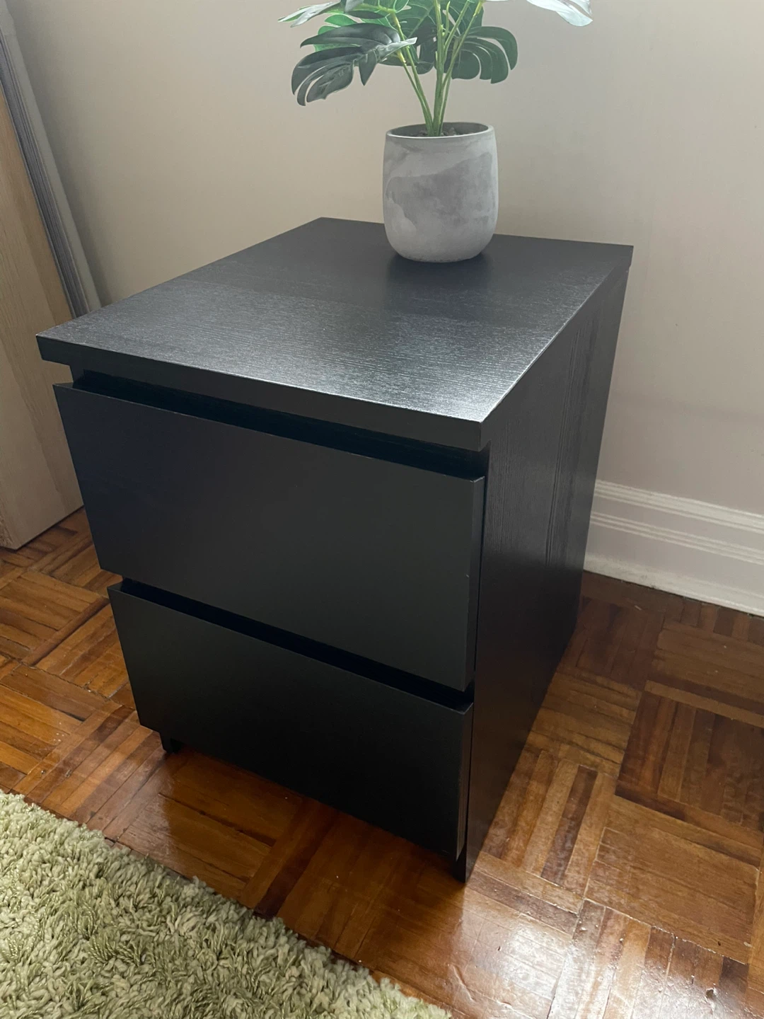 Selling a black nightstand with two drawers. It's in good condition and perfect for a bedside table.