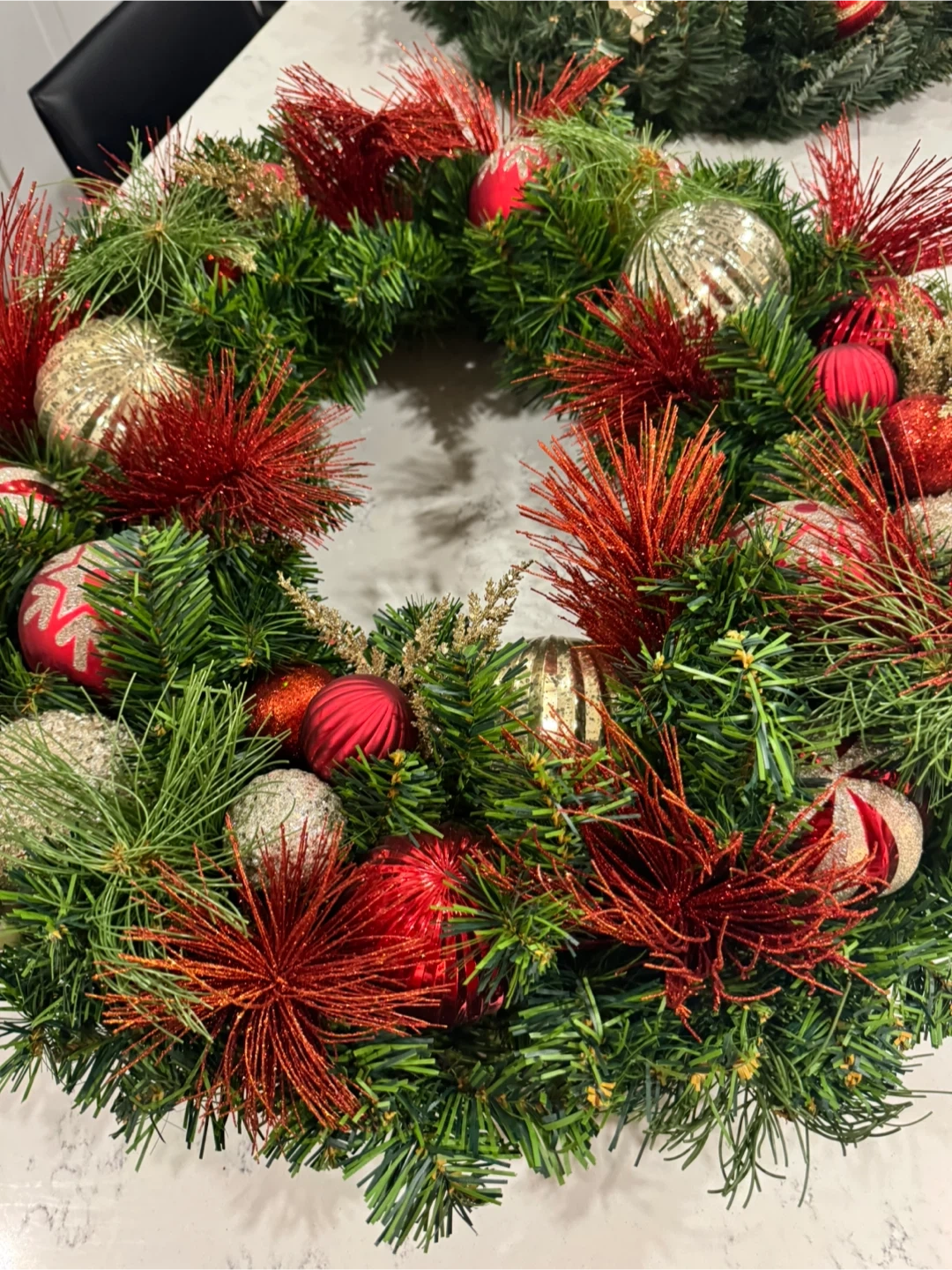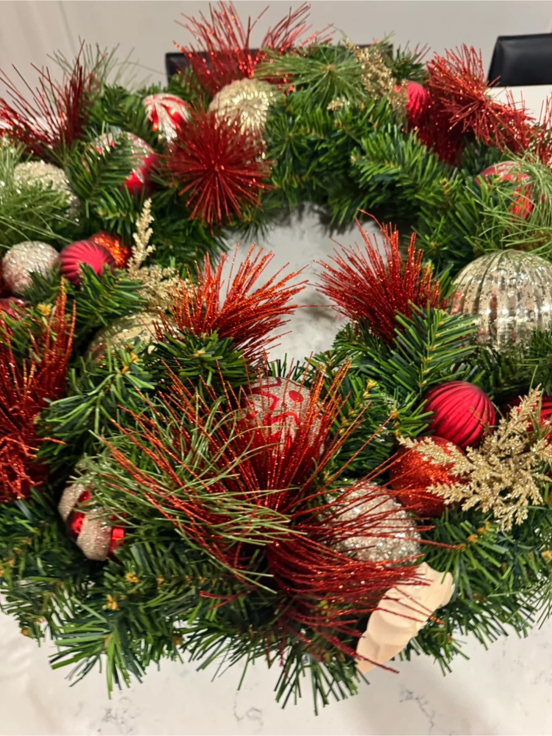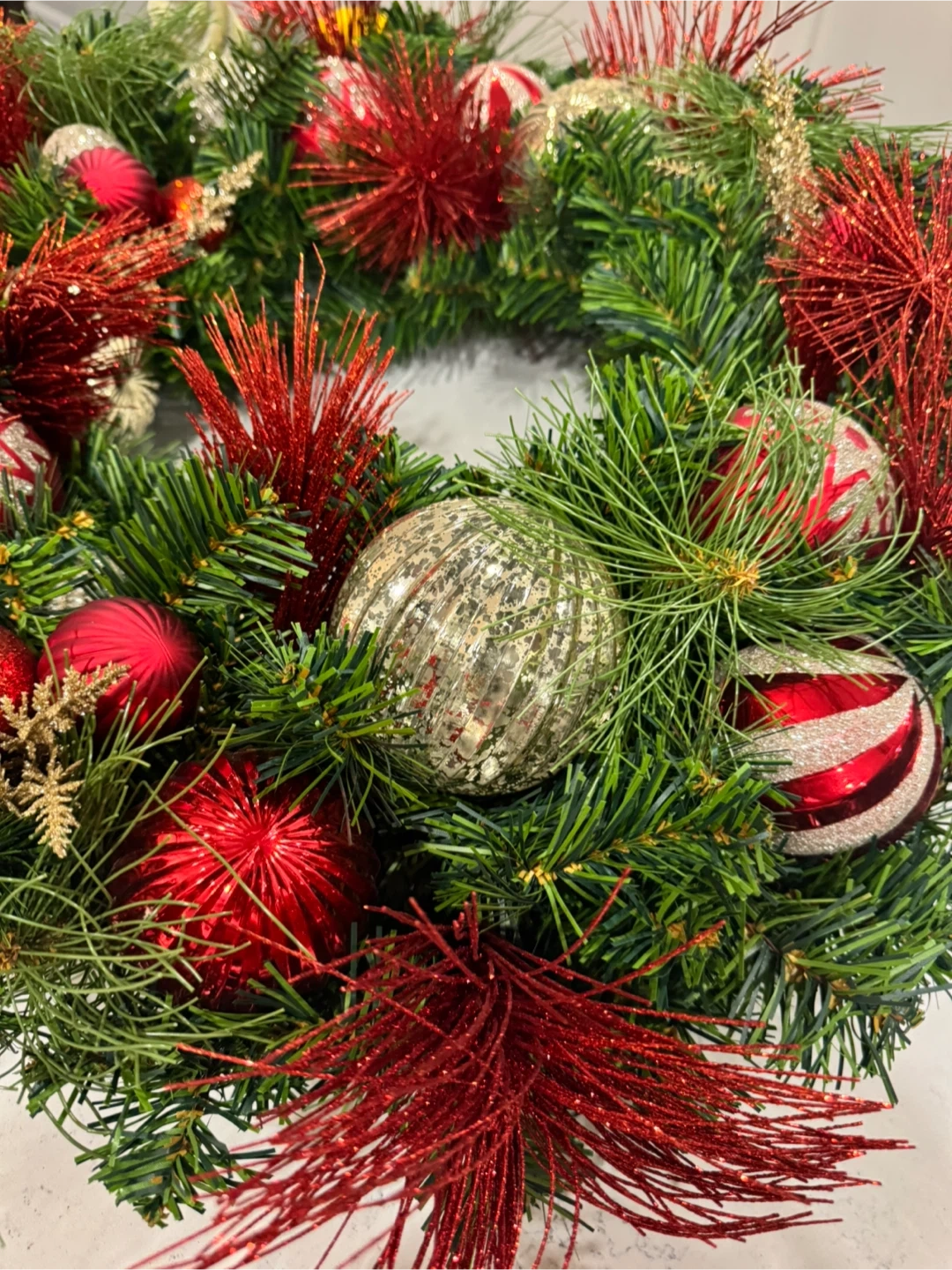 Festive Christmas wreath featuring red and gold ornaments! It's perfect for adding a touch of holiday cheer to your home. The wreath measures approximately 24 inches in diameter.