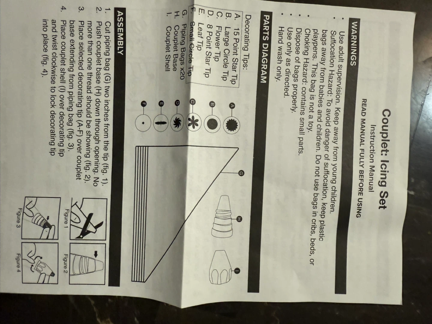 Selling a Couplet Icing Set, which includes decorating tips and piping bags! It comes with the instruction manual as well. Great for anyone who loves baking and decorating cakes or cupcakes