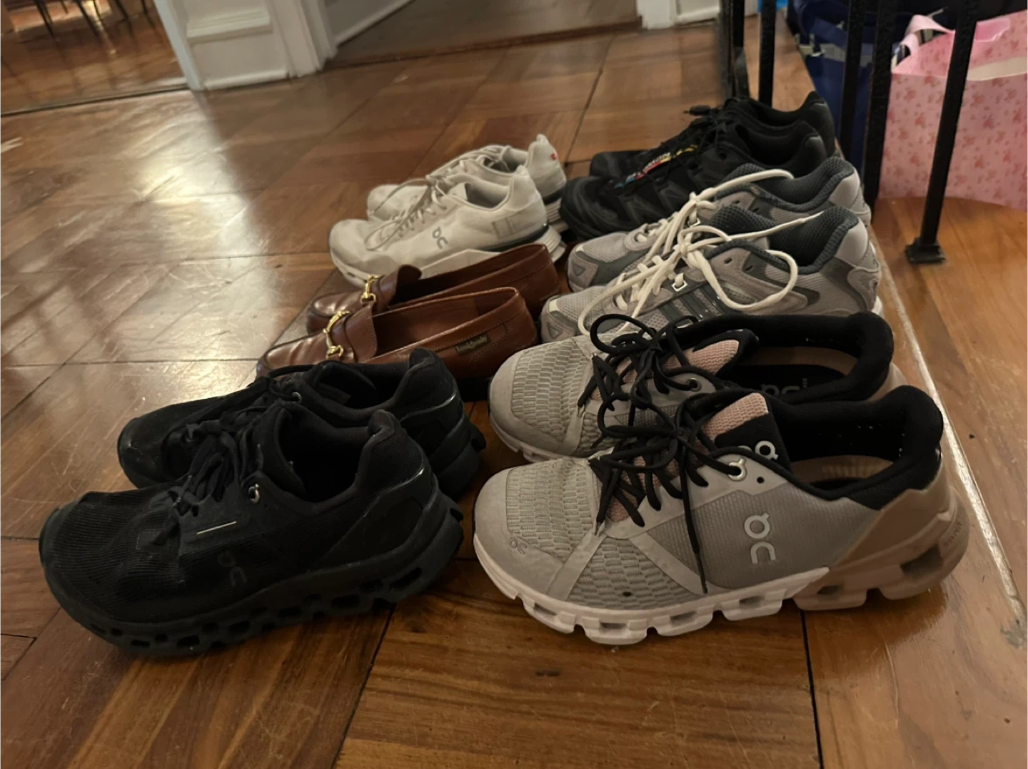 Selling a collection of used shoes including brands like On Cloud, Salomon, and Russell & Bromley. They show signs of wear but still have plenty of life left!