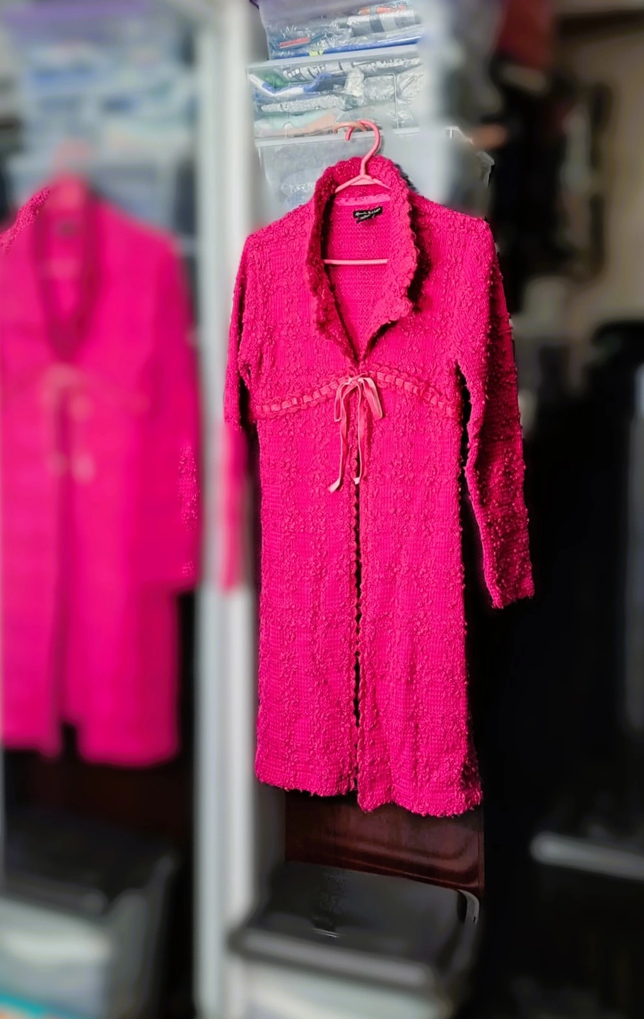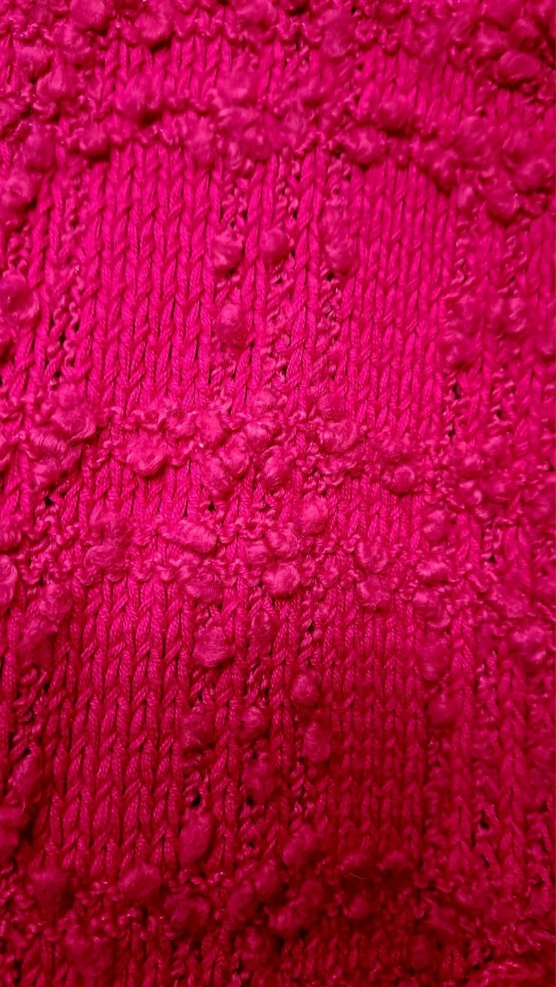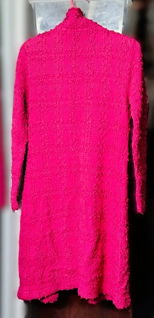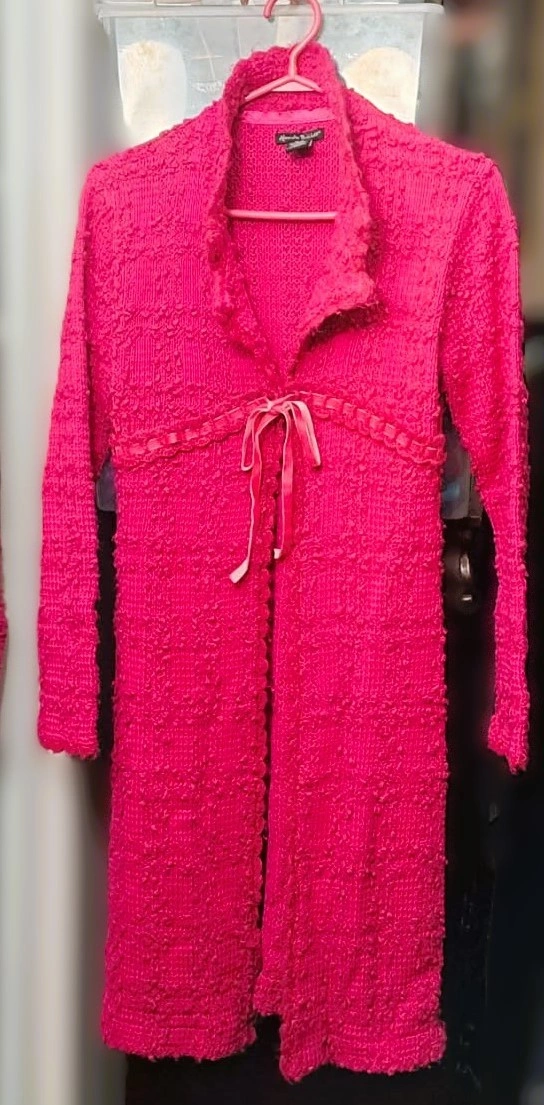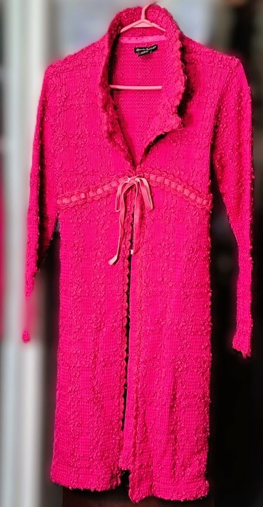 Alexandra Bartlett vintage hot pink, long, open-front cardigan with a textured "popcorn" or "bouclé" knit and a ribbon tie closure. It is a women's sweater/outerwear item suitable for layering. The front is open, with a thin matching ribbon for tying at the chest. In excellent condition. Well kept and cared for beautifully.