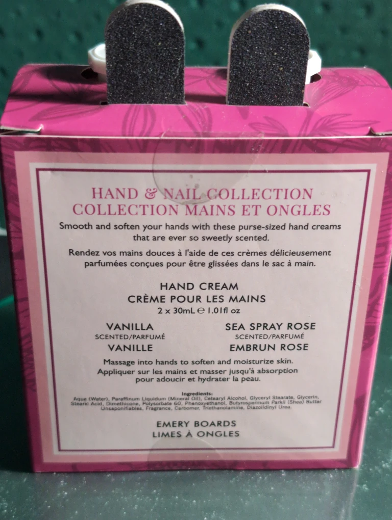 Selling a brand new The Bath & Body Hand & Nail Collection! This set includes two purse-sized hand creams in Vanilla and Sea Spray Rose scents, each 30ml (1.01 fl oz), to smooth and soften your hands. Also included are emery boards. Perfect for keeping your hands moisturized and looking their best on the go!