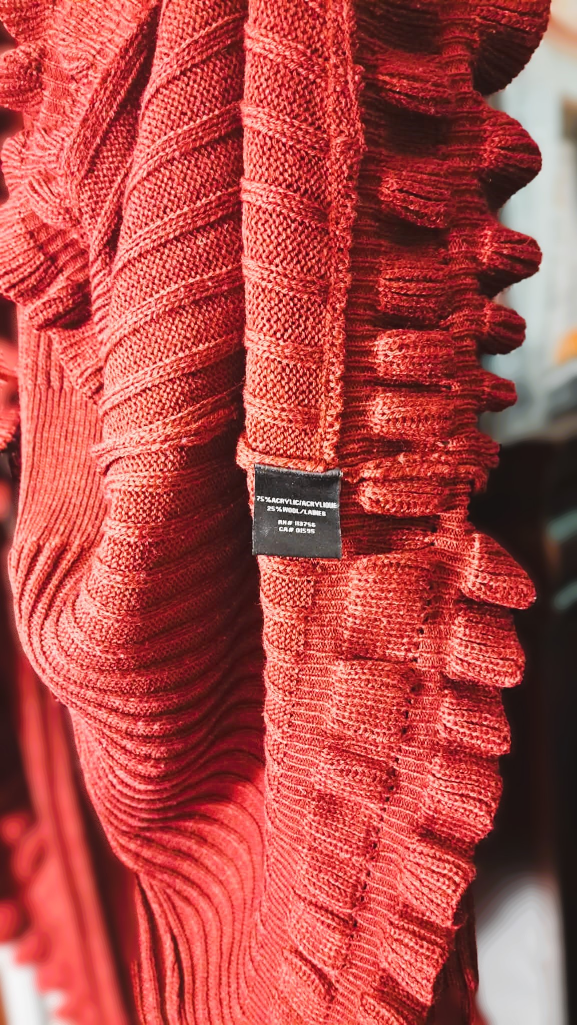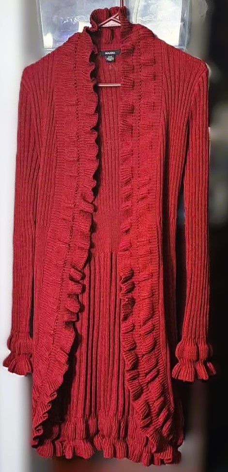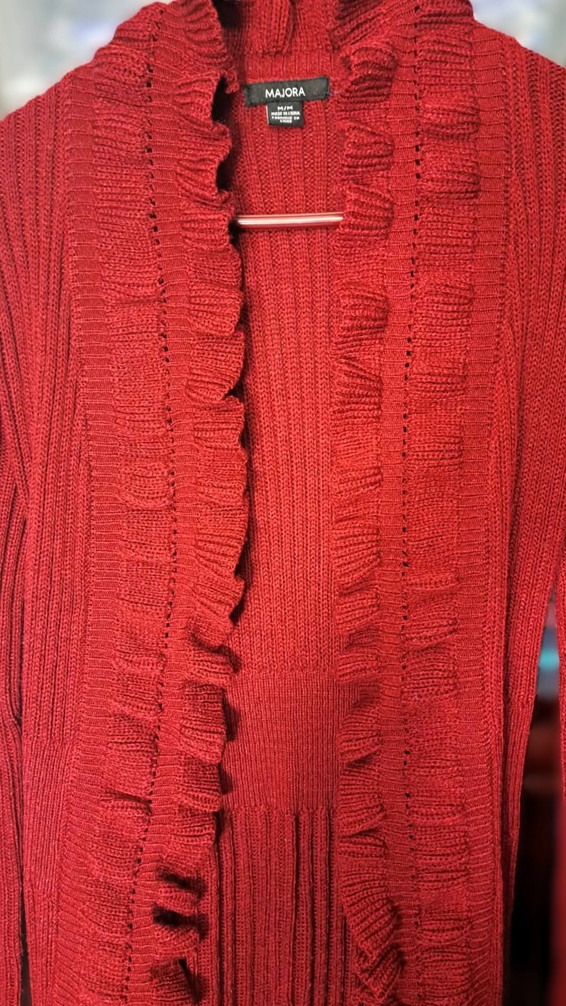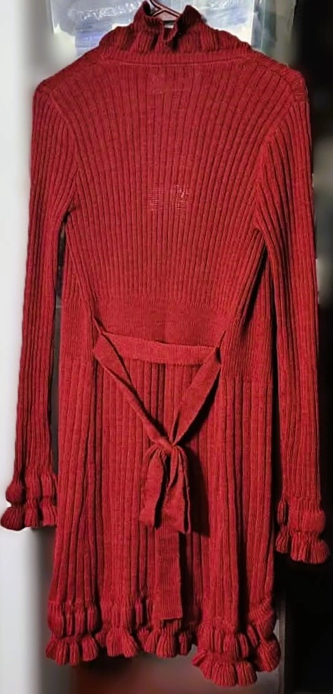 Wine Red or burgundy open-front cardigan sweater with cascading ruffles along the opening, cuffs, and hem and matching tie-front or tie-back belt to cinch the waist. It features a ribbed knit design and long sleeves. Prominent ruffles along the front opening, bottom hem, and sleeve cuffs, with a vertically ribbed texture throughout. Used like New. In excellent condition. Well kept and cared for beautifully.