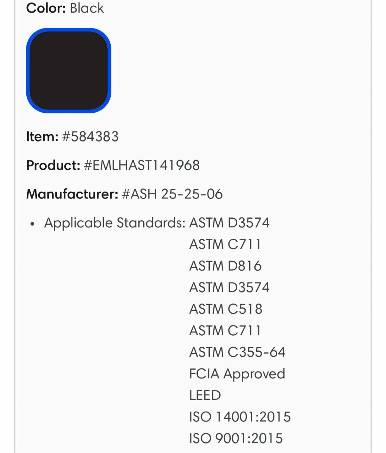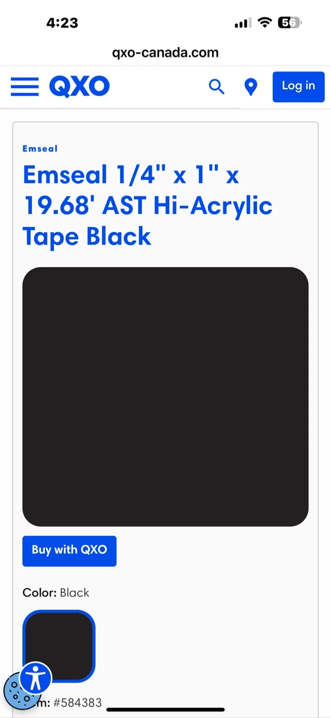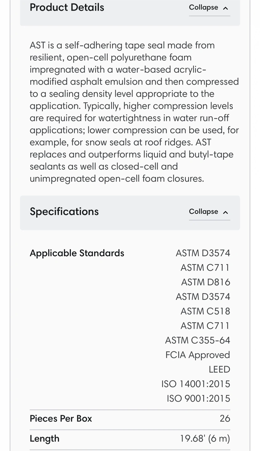 Selling a roll of Emseal AST HI-Acrylic tape seal. It's black and made from resilient, open-cell polyurethane foam impregnated with a water-based acrylic-modified asphalt emulsion. The tape is 19.68' (6 m) long and 1/4" x 1".