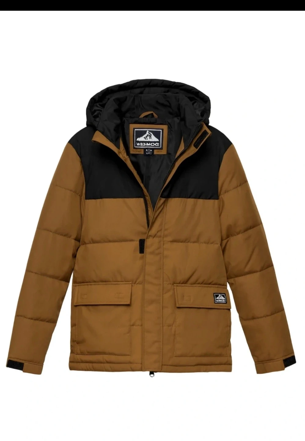 Here's a WESMOG puffer jacket in a stylish brown and black colour block design! It looks like it's in great condition and ready to keep you warm this winter