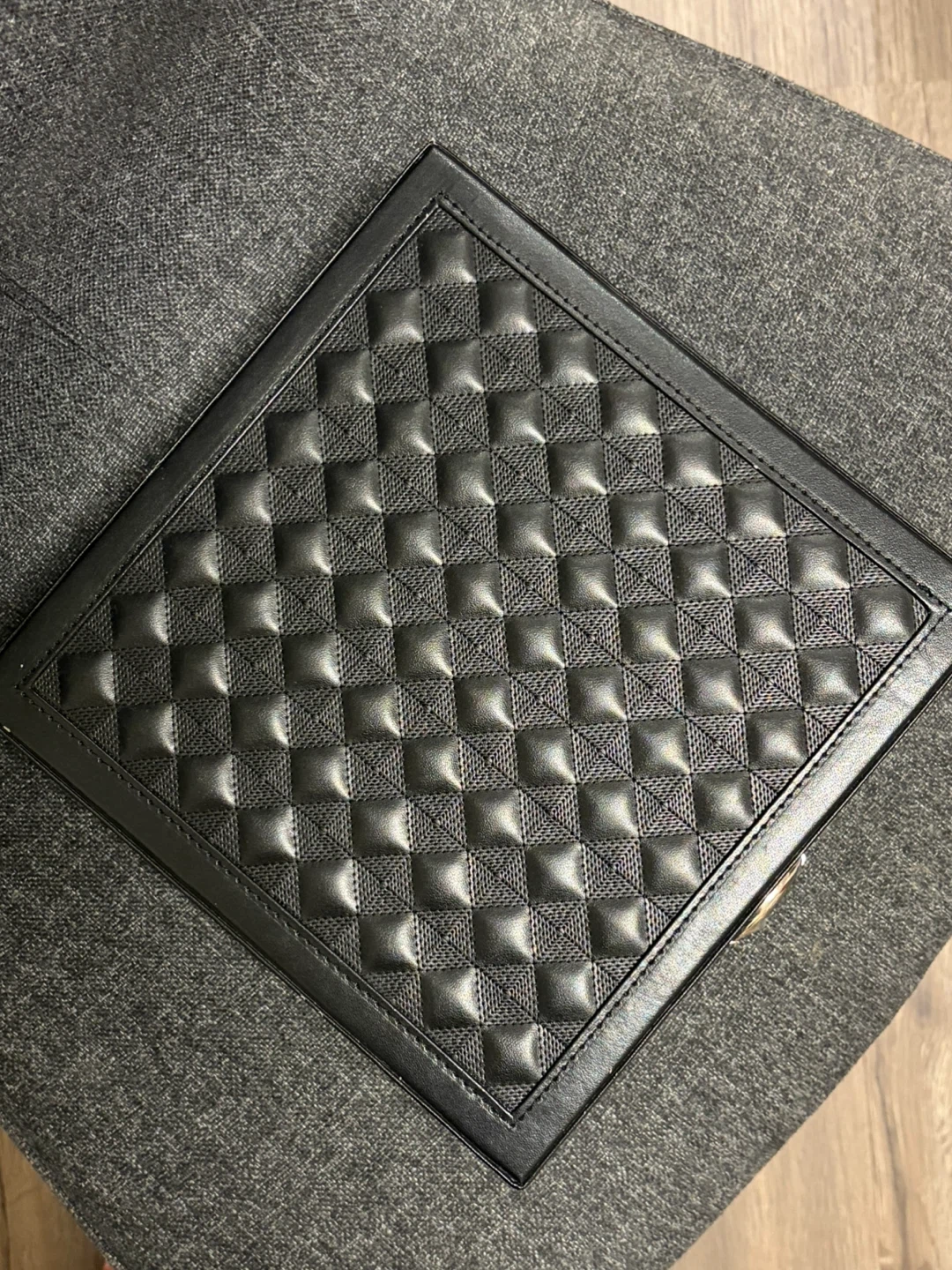 It has a quilted design on top and a mirror inside. It also comes with a key to keep it locked! + small removable jewelry box inside