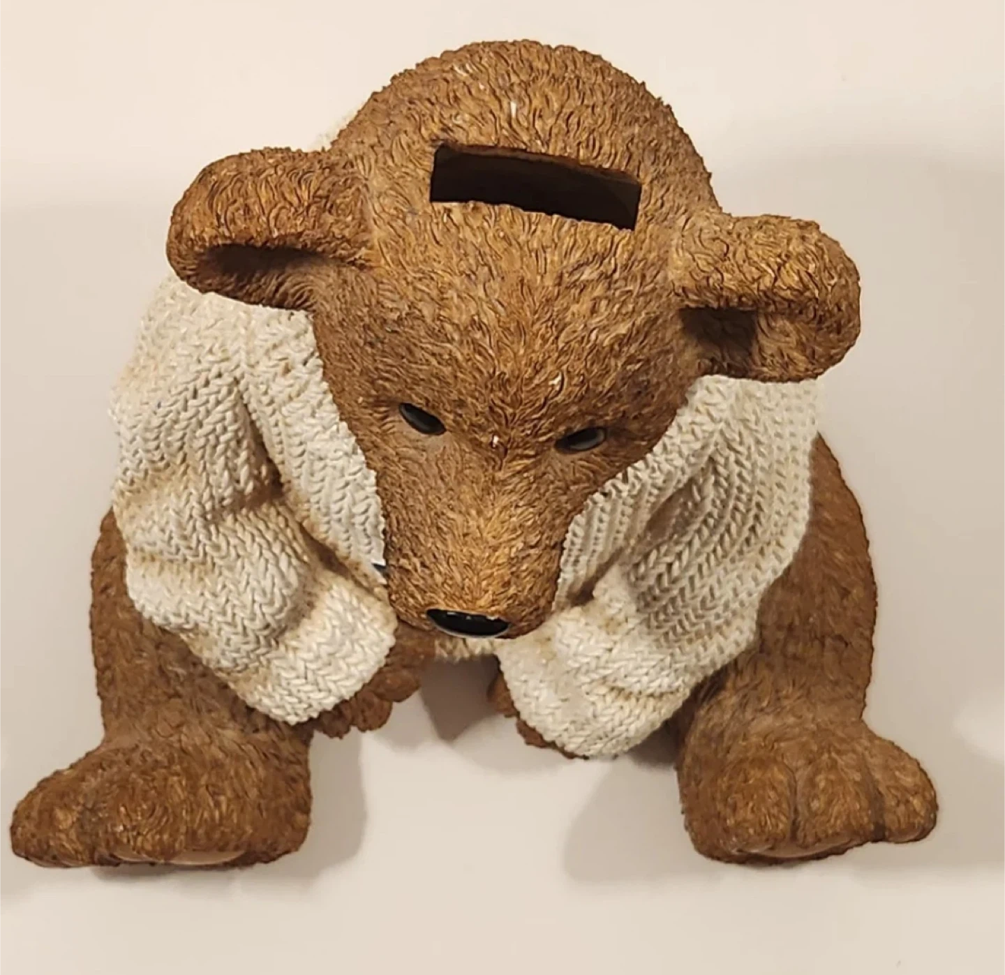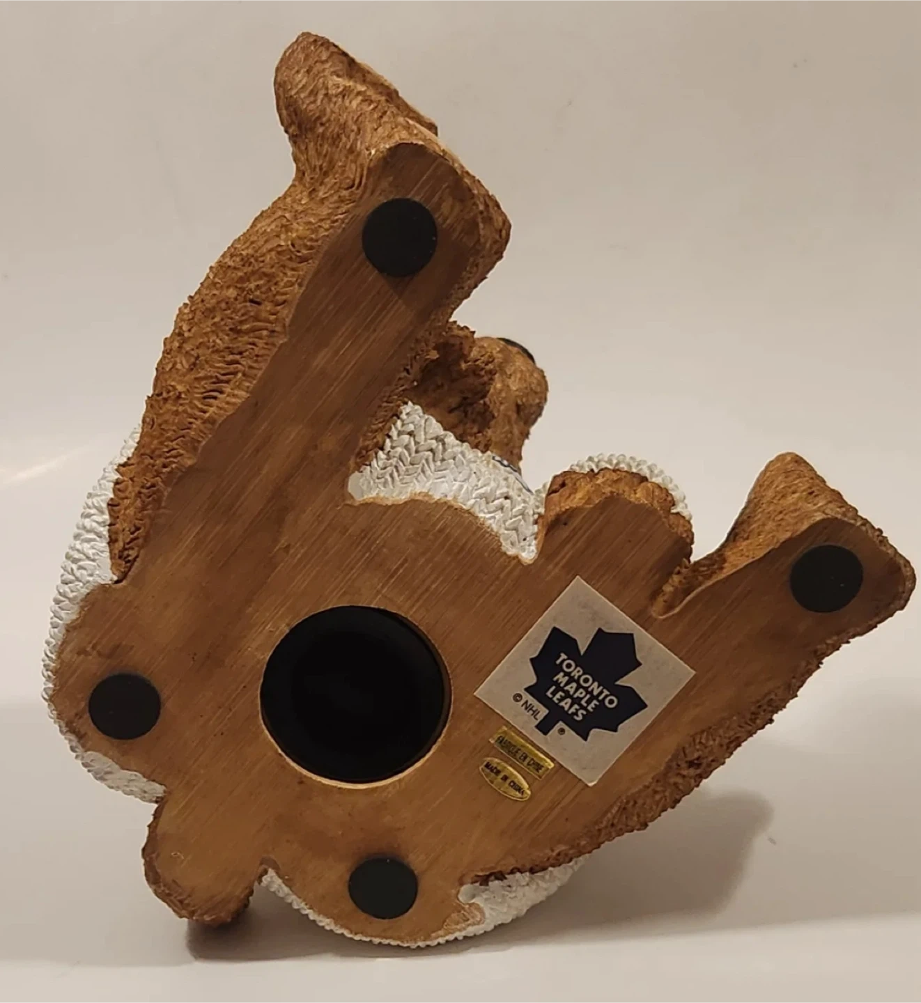 Here's a Toronto Maple Leafs bear bank! It's a cute way to save your change and show off your team spirit. The bear is wearing a sweater with the Leafs logo. It's in great shape and ready for a new home!