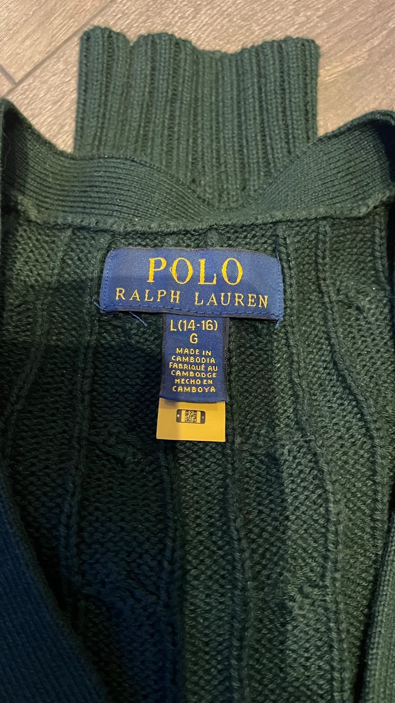 Selling a Polo Ralph Lauren royal green cardigan in size Boys L (14-16), medium-large for women. It's in great condition, authentic and has a classic cable knit.
