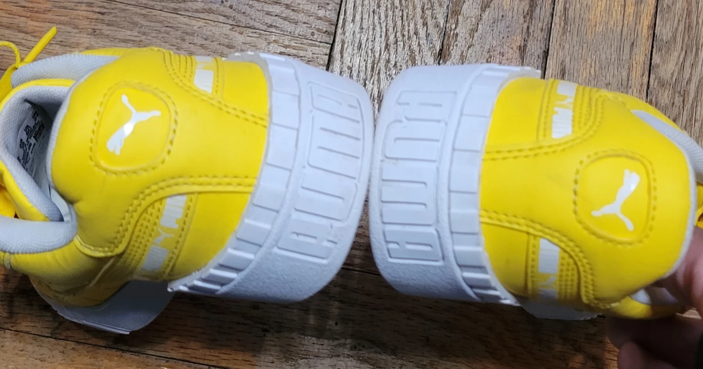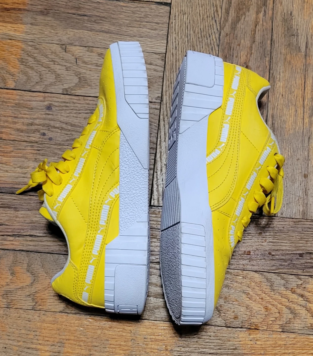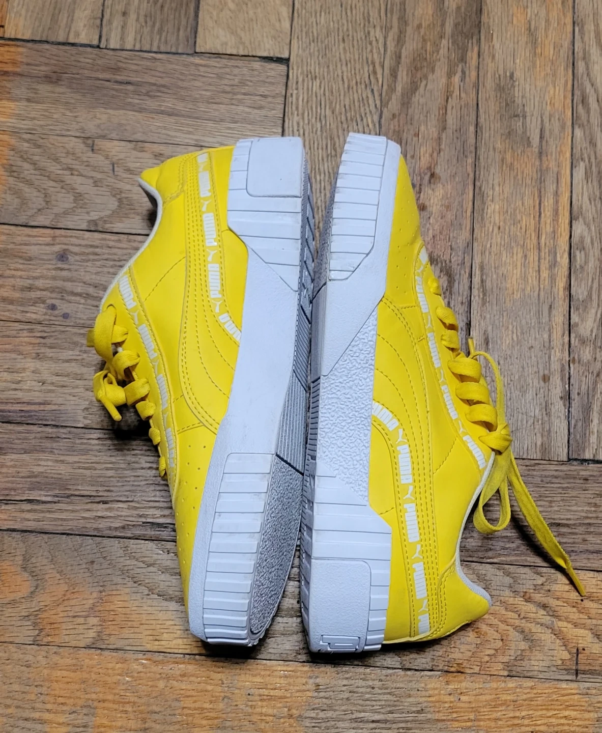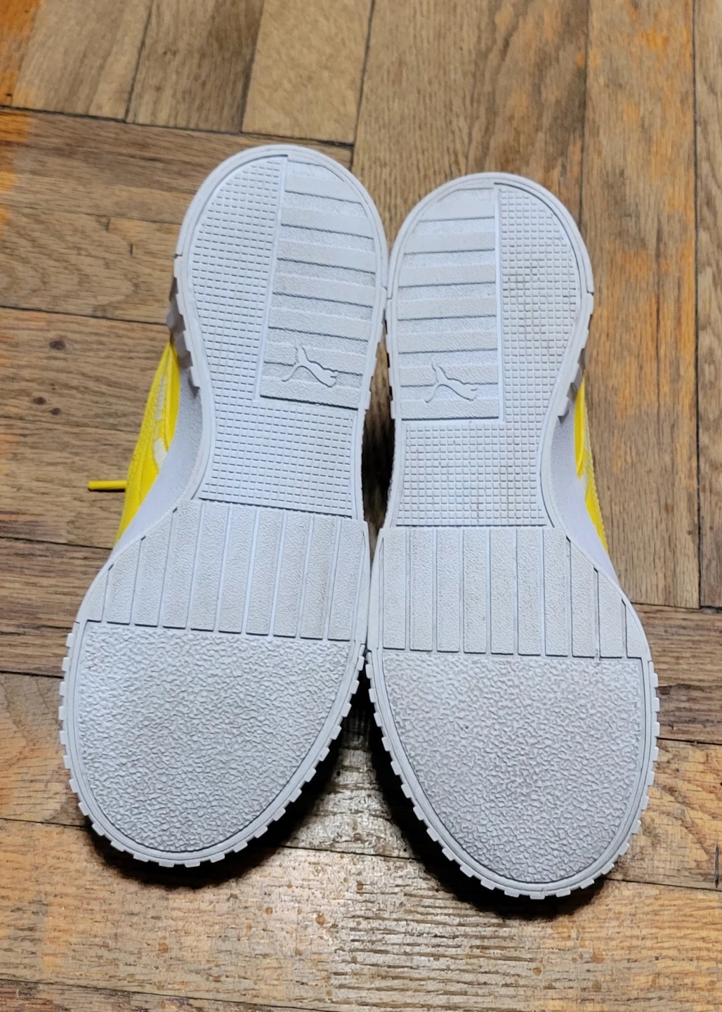 Selling a pair of Puma Calla Jr sneakers in a vibrant yellow color! They are size US 6C. These stylish sneakers are perfect for kids and feature the Puma logo. Made in Indonesia.