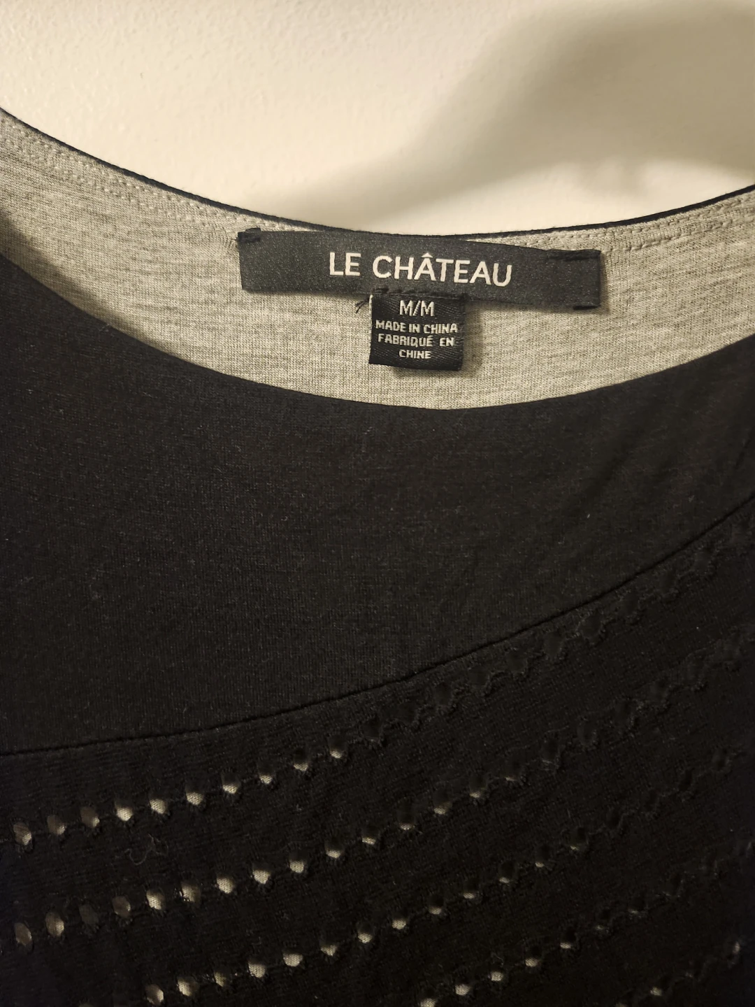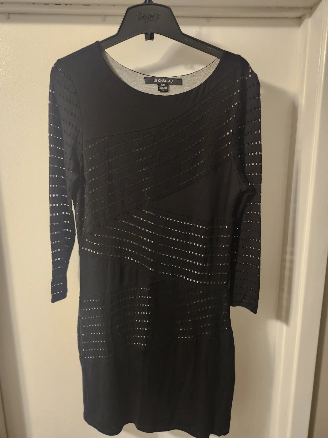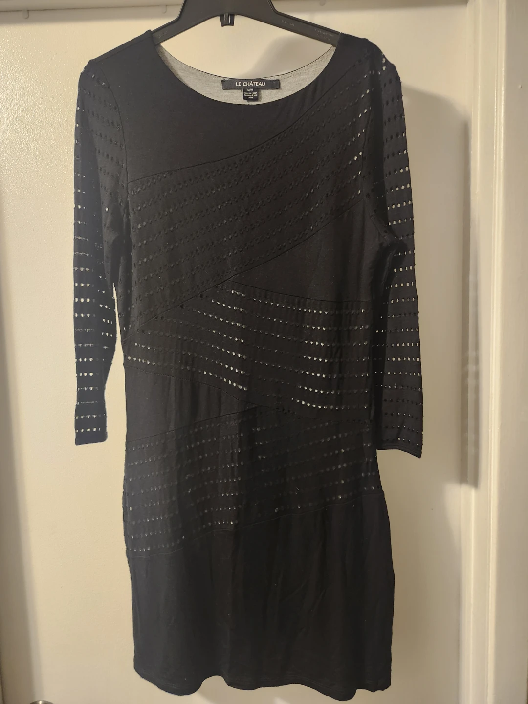 Selling a Le Chateau black dress in size medium. It has a unique design with sheer detailing throughout. Perfect for a night out or a special occasion!