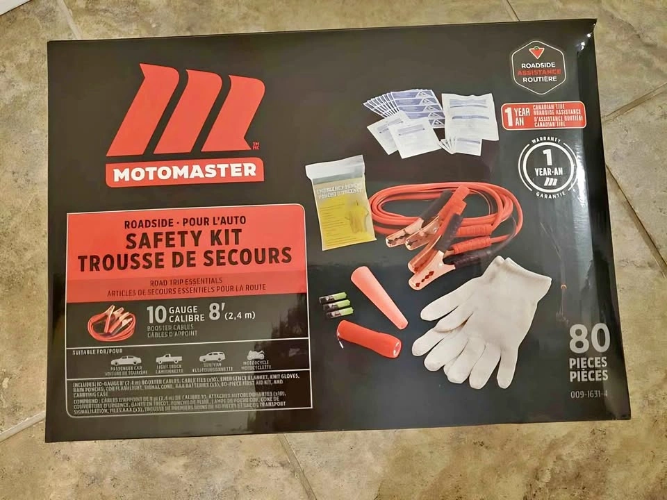 New in Box - perfect christmas gift for a person with a car. Kit includes: Carrying case, 10G booster cables, needle punch blanket, 60 piece first aid kit, LED flashlight, signal cone, 1 D cell battery, knit gloves, rain poncho, 10 pc. cable ties. Pickup pondmills