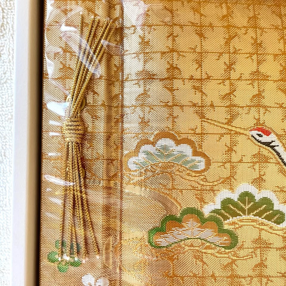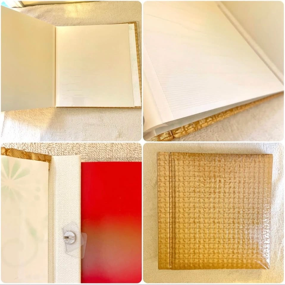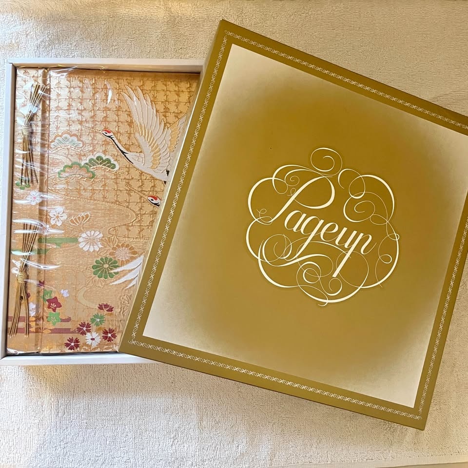 Elegant self-adhesive scrapbook-style photo album with a luxurious gold “Nishijin” woven cover, a traditional Japanese textile often used for kimonos, known for its intricate patterns and rich texture.