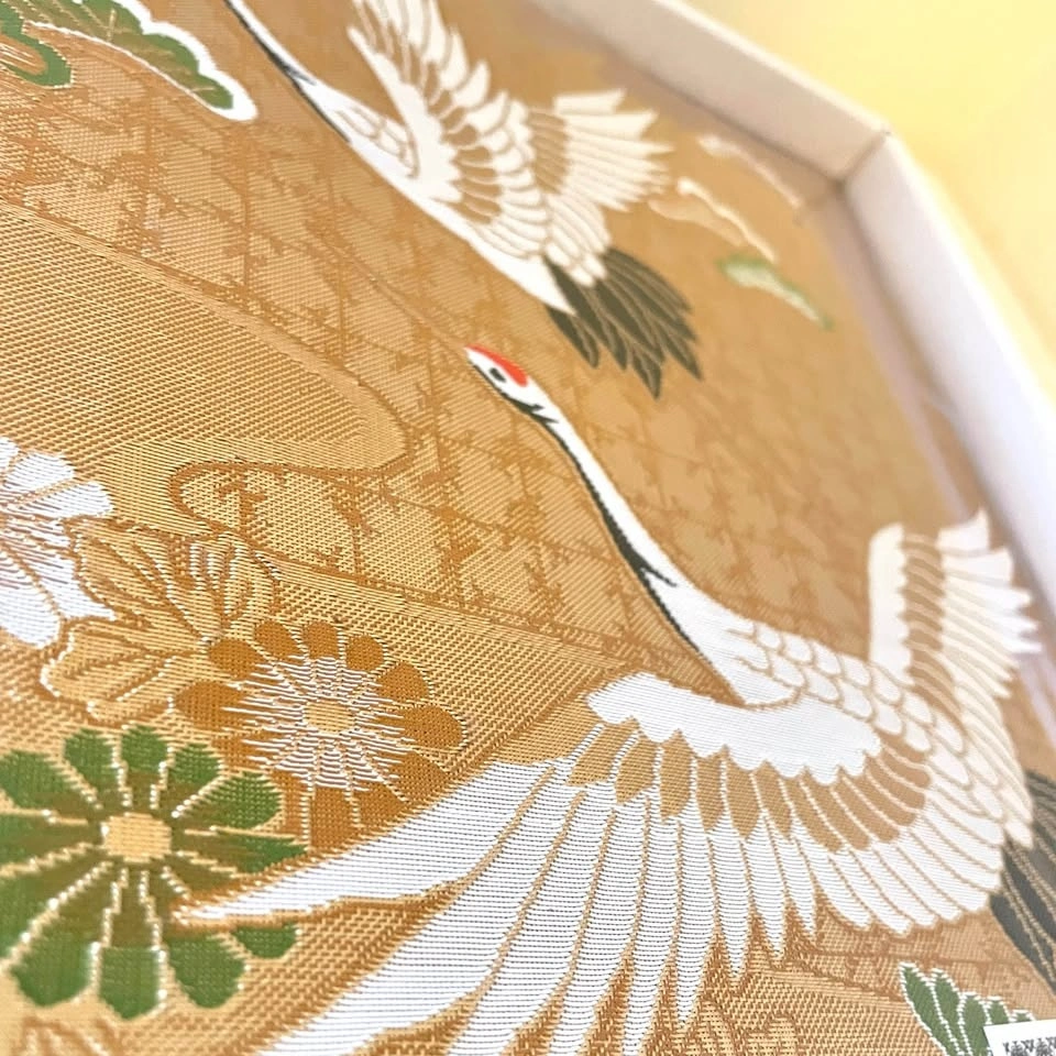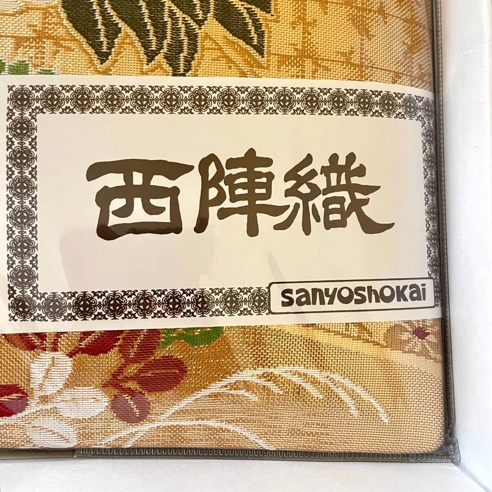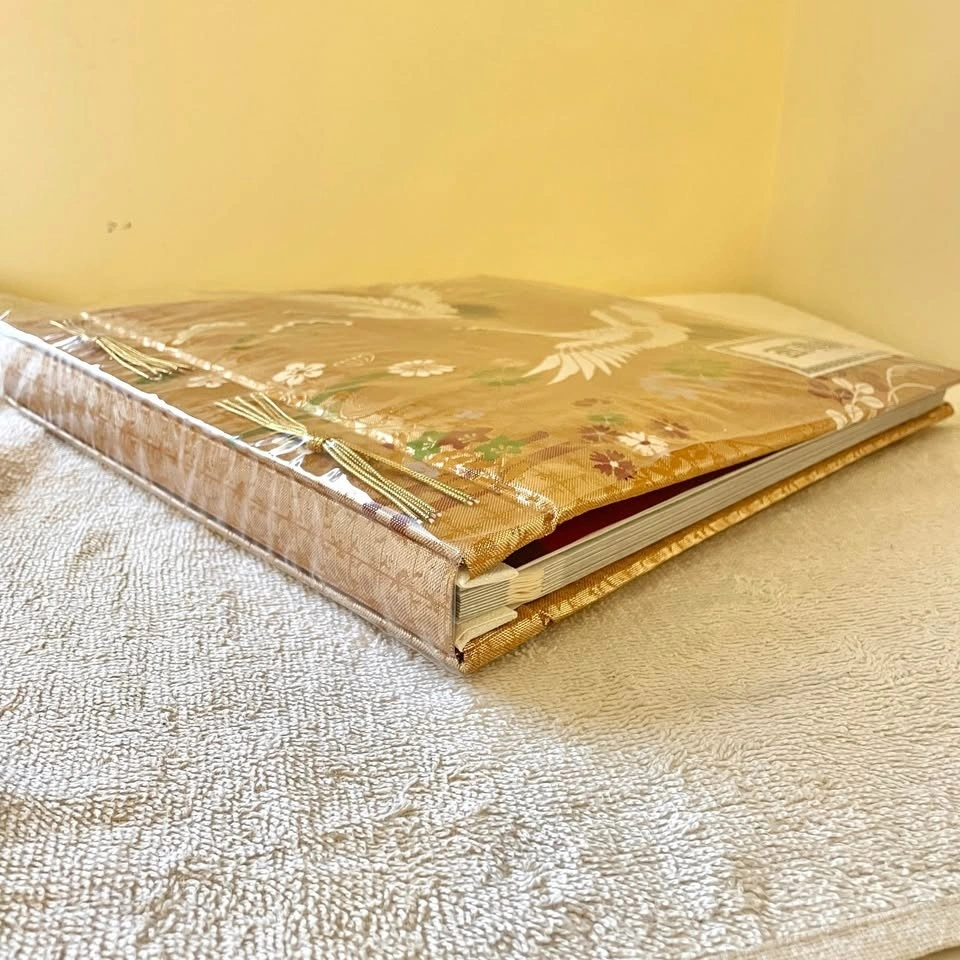 Elegant self-adhesive scrapbook-style photo album with a luxurious gold “Nishijin” woven cover, a traditional Japanese textile often used for kimonos, known for its intricate patterns and rich texture.