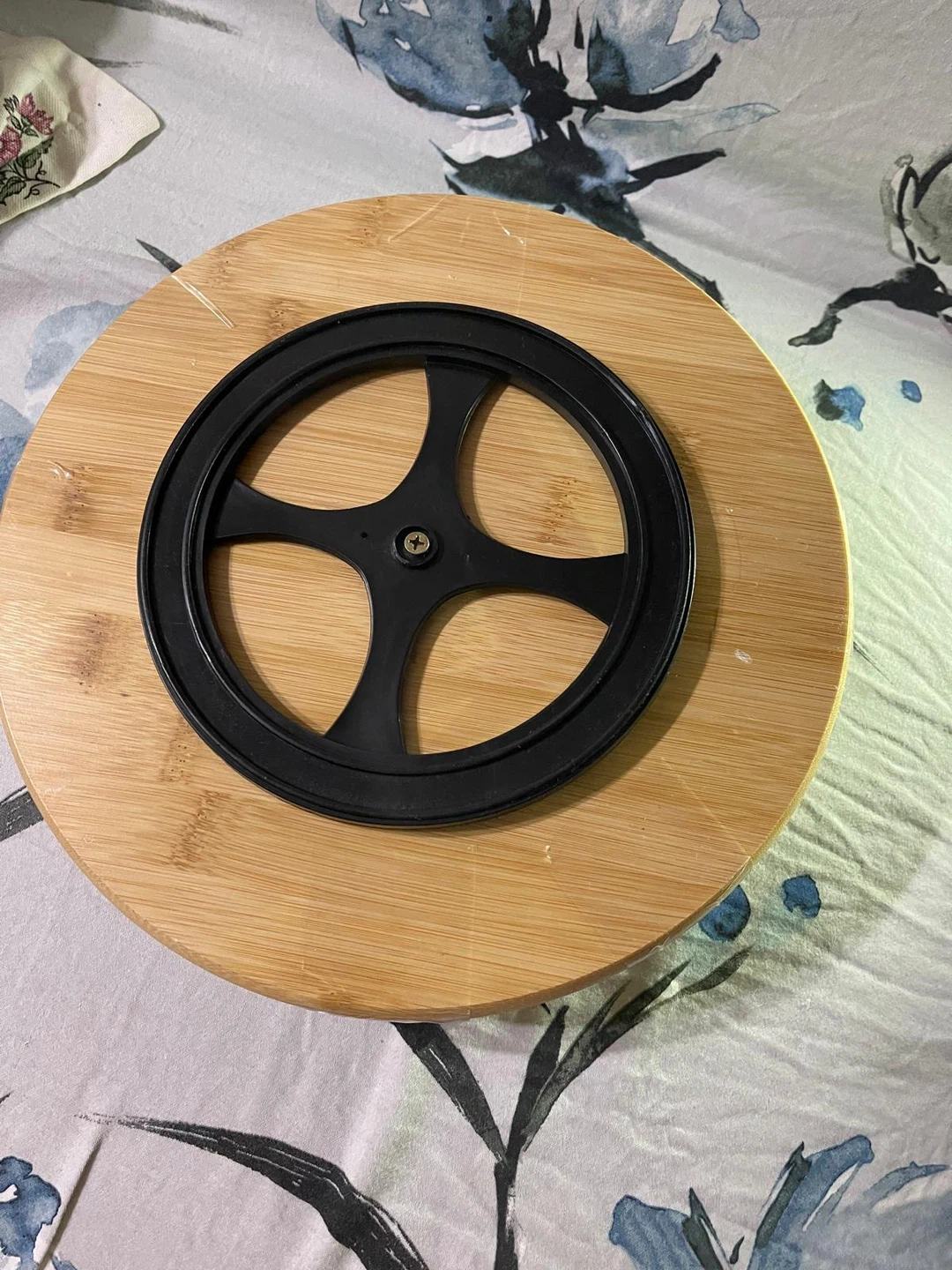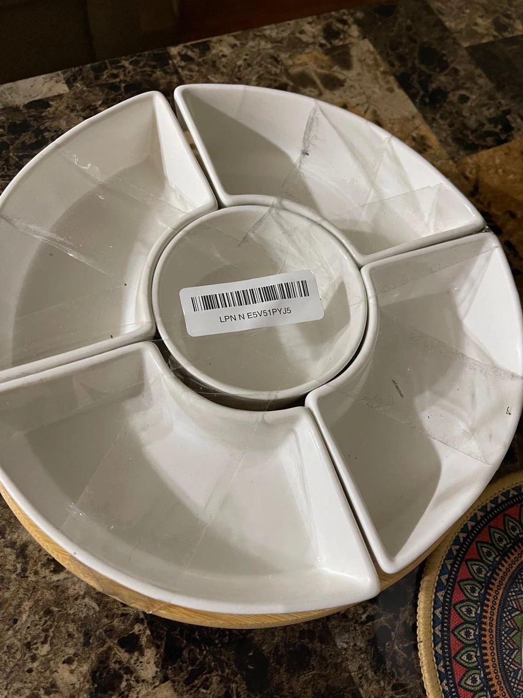 Selling a white ceramic serving platter! It has a rotating wooden base and several sections for serving different snacks or dips. It's in great condition and ready for your next gathering!