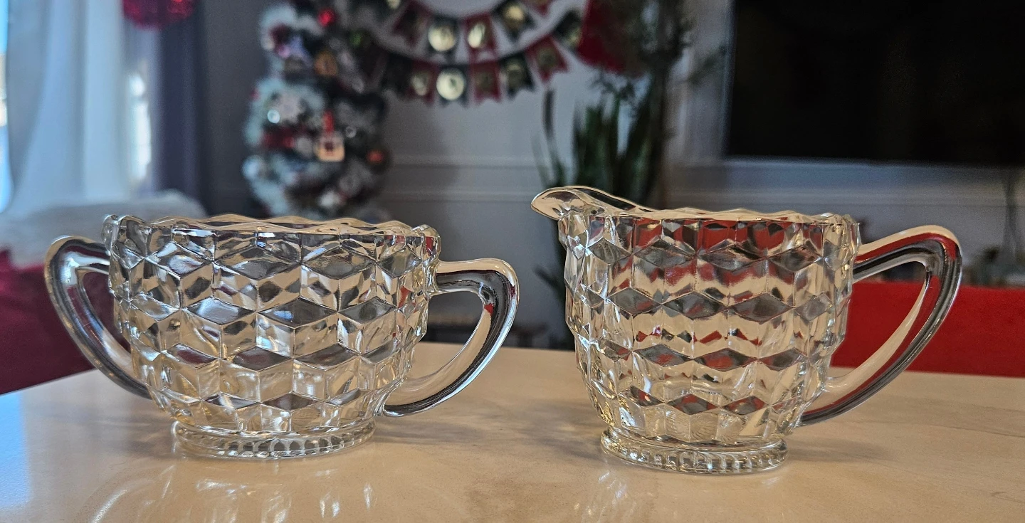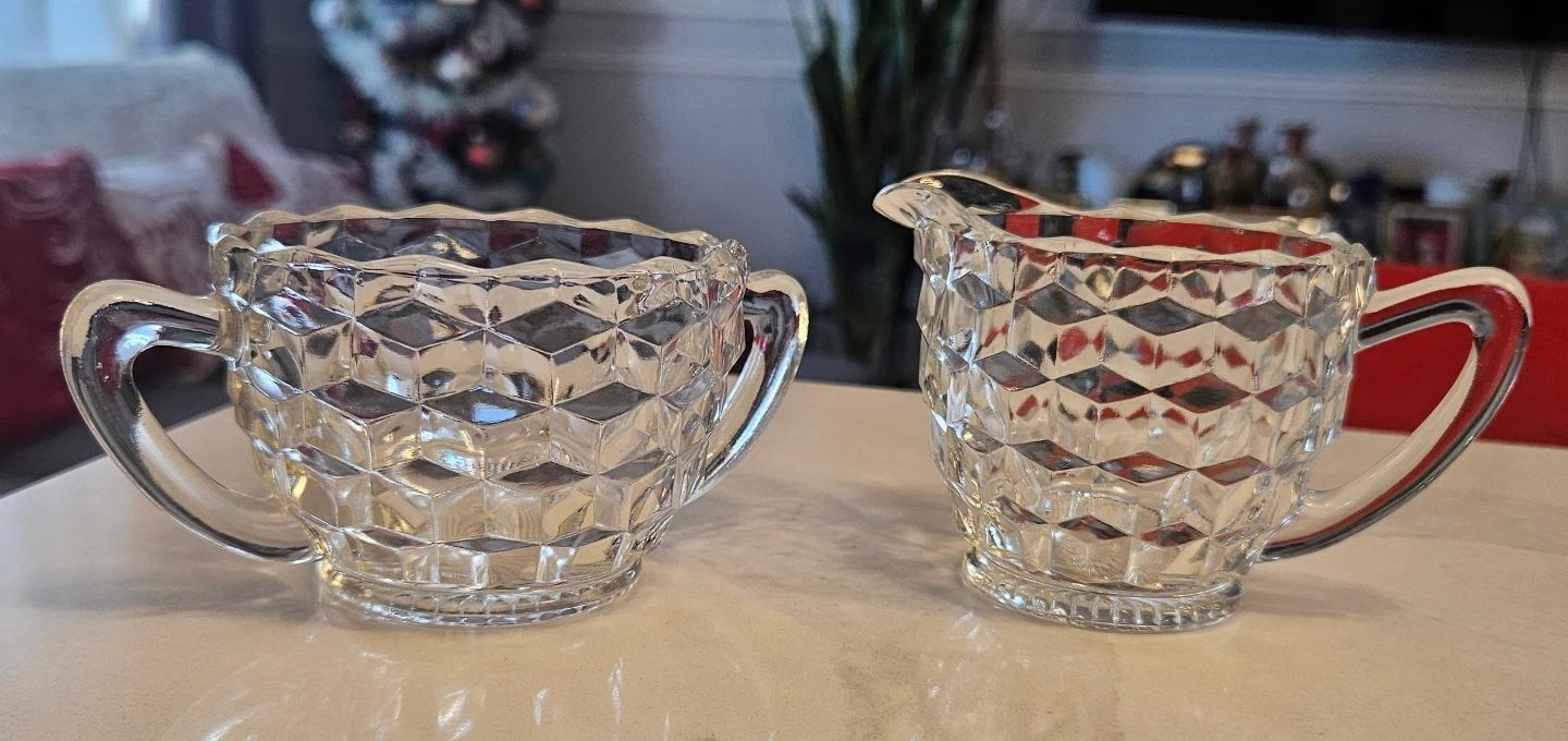 Selling a lovely vintage creamer and sugar bowl set. The clear glass has a nice textured pattern. Perfect for adding a touch of classic elegance to your table!