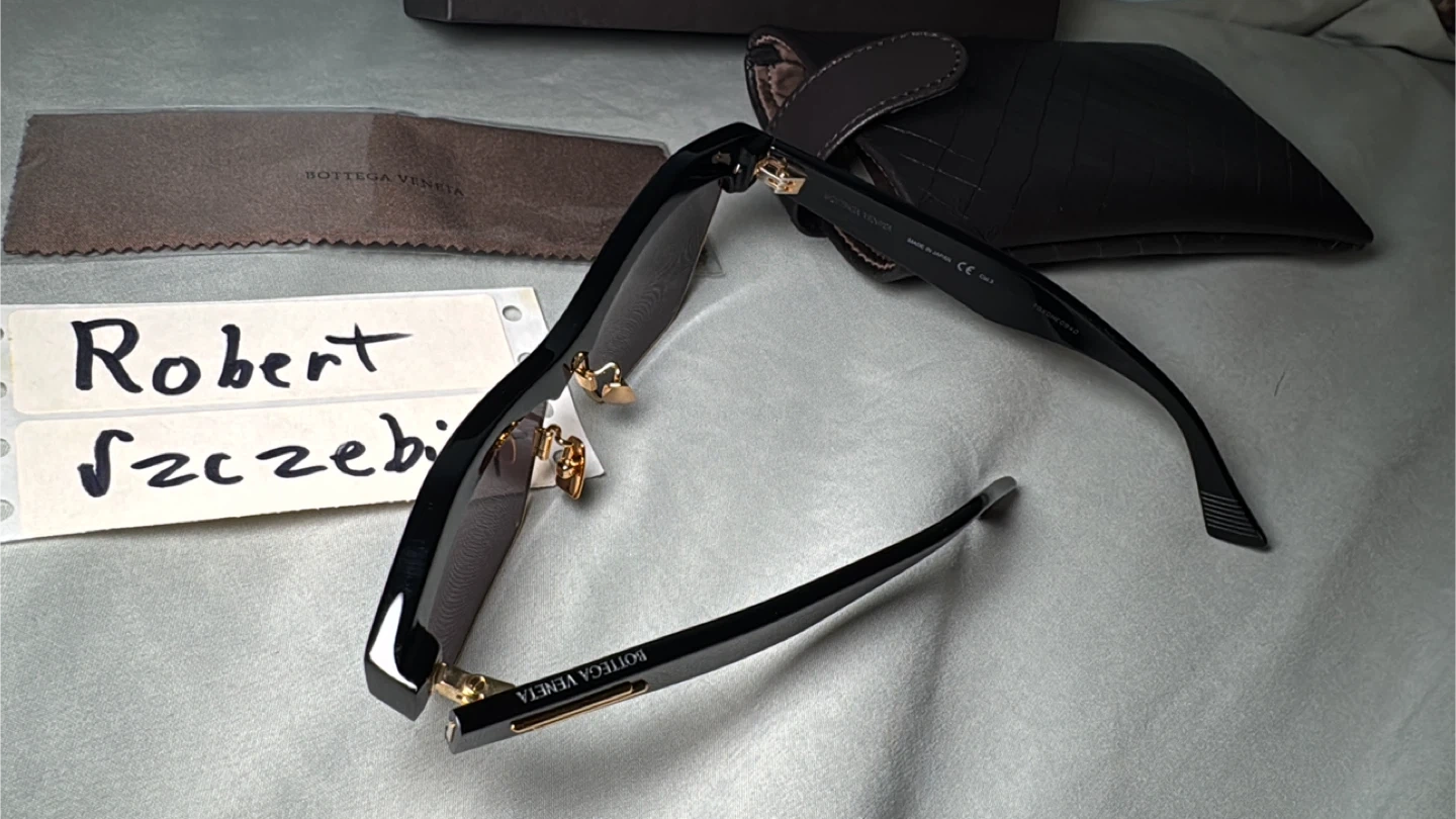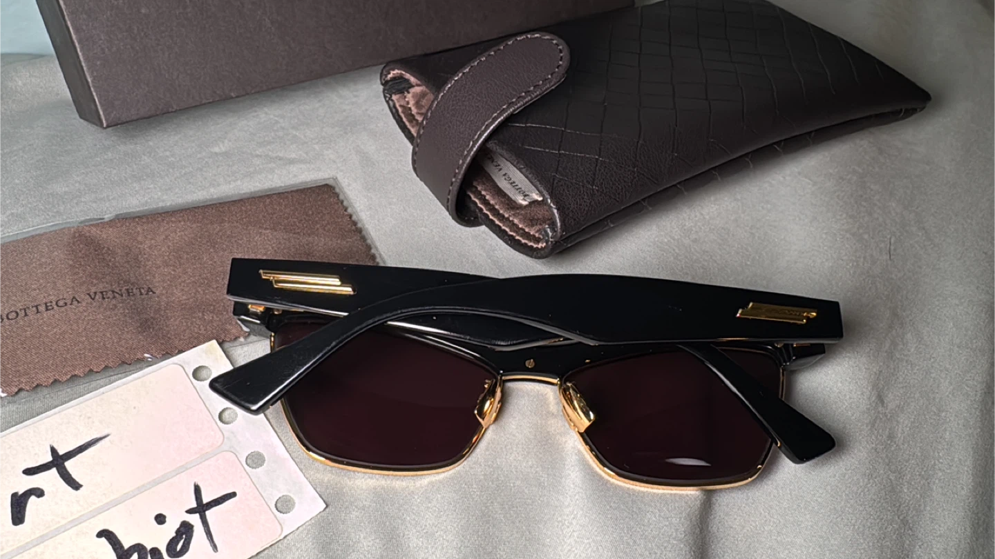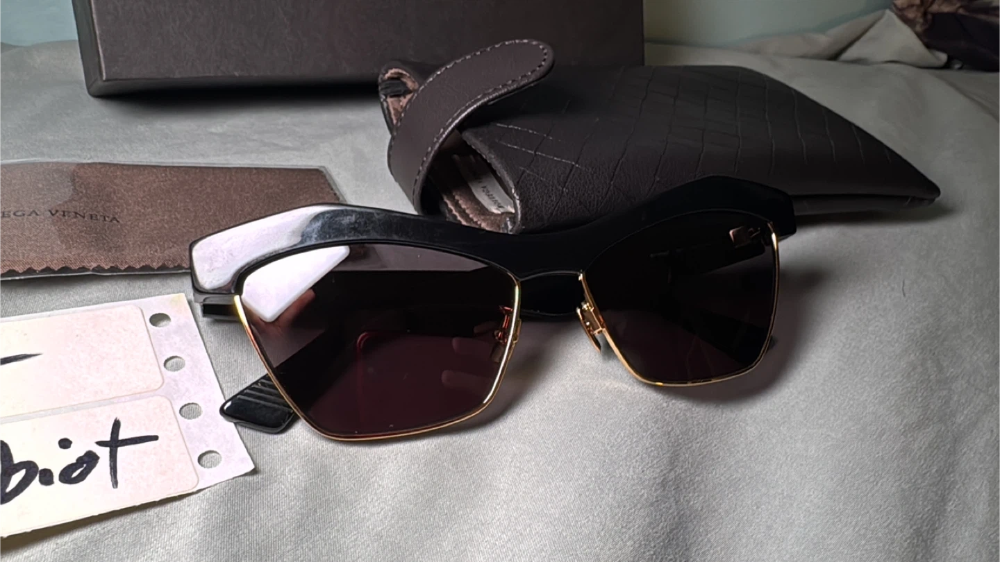 Add a touch of Italian luxury to your look with these Bottega Veneta half-rim sunglasses. The sunglasses feature a stylish black and gold frame with brown lenses, offering both fashion and UV protection. These sunglasses are in new just were tried on, complete with the original case and cleaning cloth.