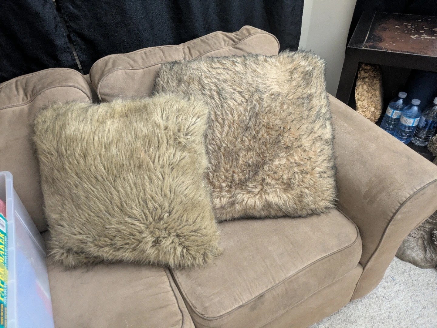 Selling a cozy faux fur throw pillow! It's in great condition and would add a touch of warmth to any room. The pillow has a zipper so you can remove the cover for easy cleaning. It's a mix of brown and beige tones