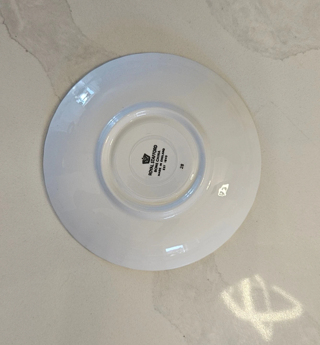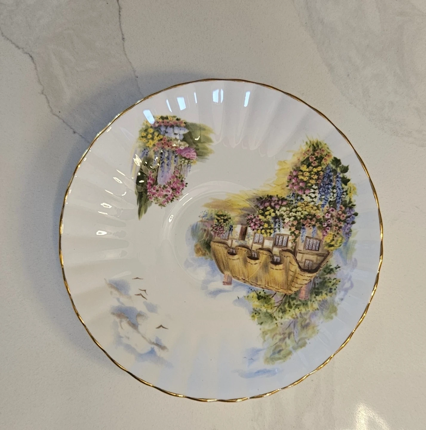 Selling a Royal Stafford Bone China saucer, made in England. It has a beautiful design with a cottage and flowers. The saucer is in great condition and would be a lovely addition to any collection