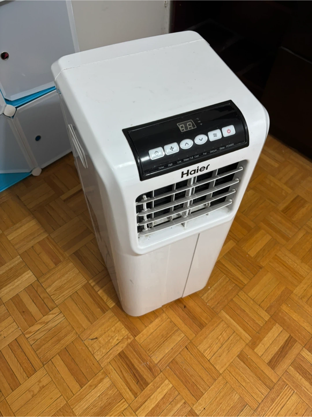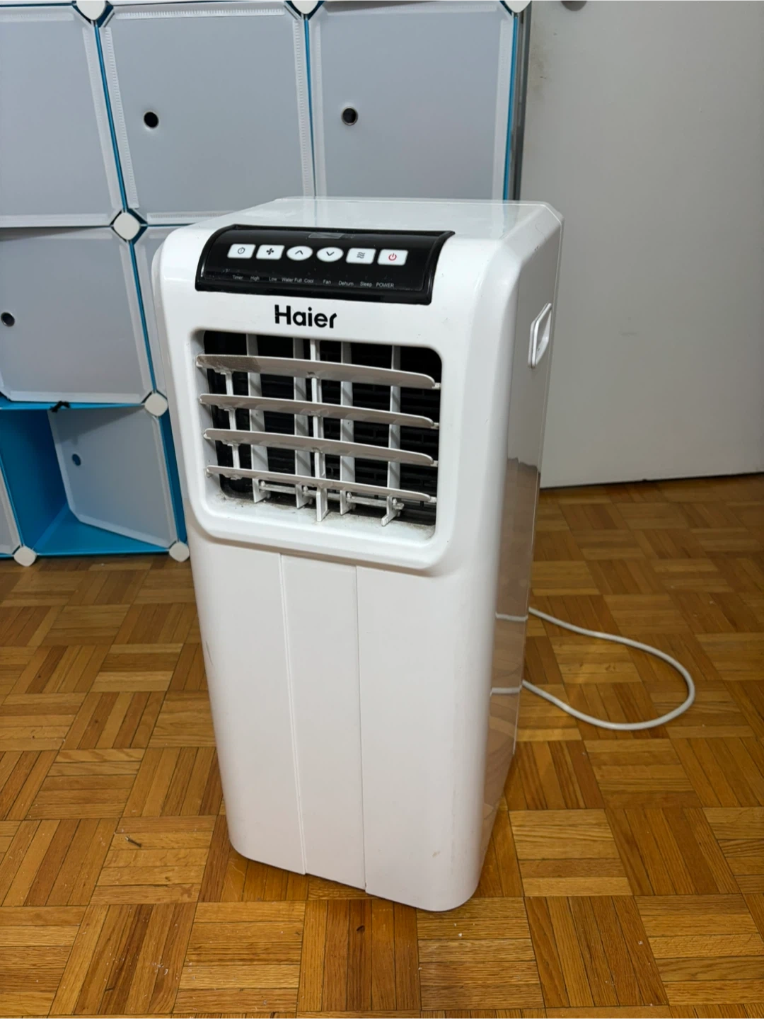 I'm selling a Haier portable air conditioner in great condition! It's perfect for cooling down a room quickly and easily. It has different modes like dry, low, high, cool, fan, and dehumidify. It also has a sleep power function. Great for those hot summer days!