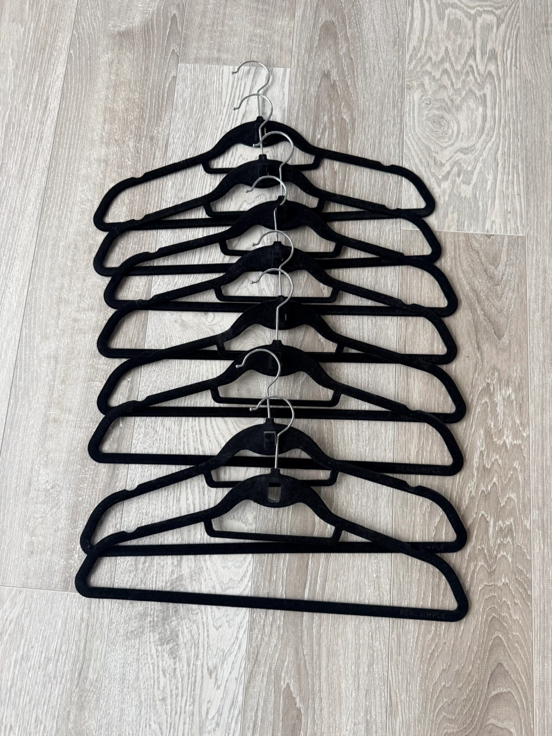 Selling a set of 60 black velvet hangers! They're in great condition and ready to keep your clothes organized and wrinkle-free. Perfect for any closet!
