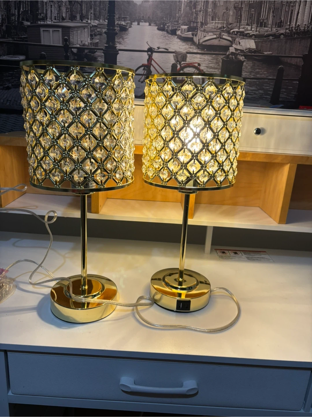 Selling a set of two beautiful gold crystal table lamps. They add a touch of elegance to any room! Perfect for bedside tables or living room decor