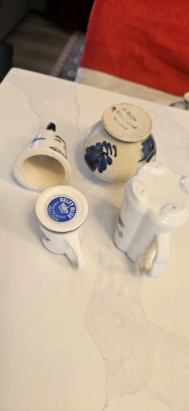 Selling a charming vintage Delft Blue Holland decorative set. This set includes a small mug, a bell, a vase, and a pitcher, all adorned with traditional blue and white Dutch scenes. Perfect for adding a touch of classic European decor to your home!