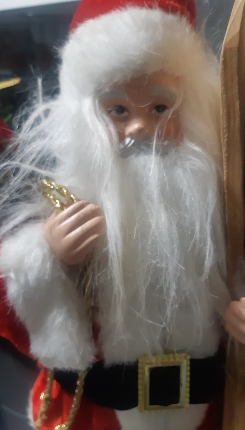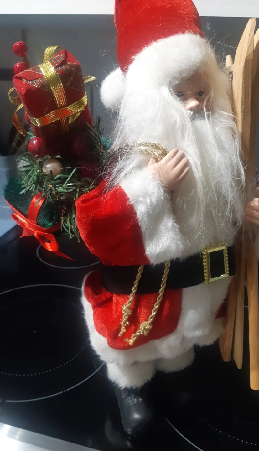 Here's a charming Santa Claus figurine! He's dressed in his classic red and white suit, complete with a gold belt buckle. He's also carrying a set of skis, ready for some winter fun!