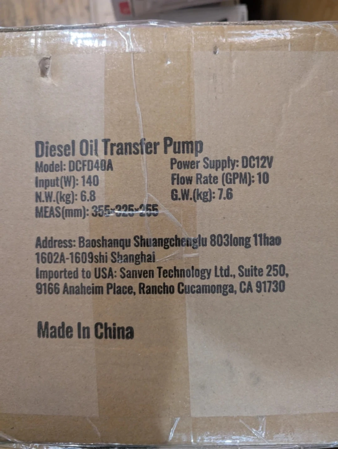 Selling a Diesel Oil Transfer Pump, model DCFD40A. It has a power supply of DC12V and a flow rate of 10 GPM.