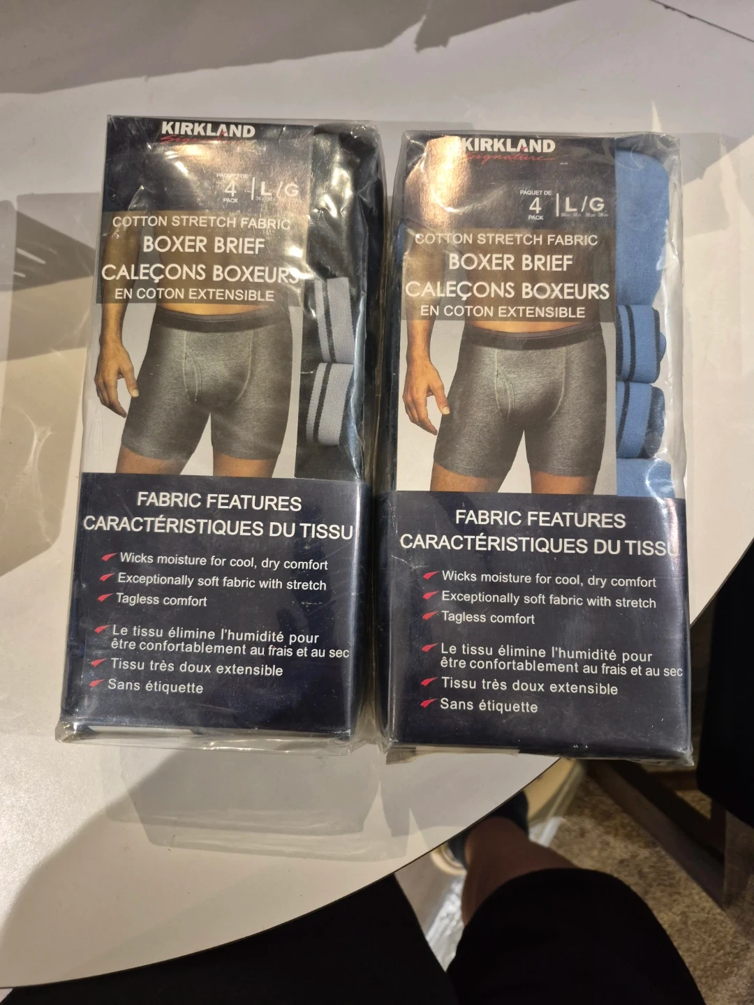 Selling two packs of Kirkland Signature men's boxer briefs, size large. Each pack contains 4 pairs of cotton stretch fabric boxer briefs. They feature moisture-wicking fabric for cool, dry comfort, and are exceptionally soft with stretch. They're also tagless for extra comfort!