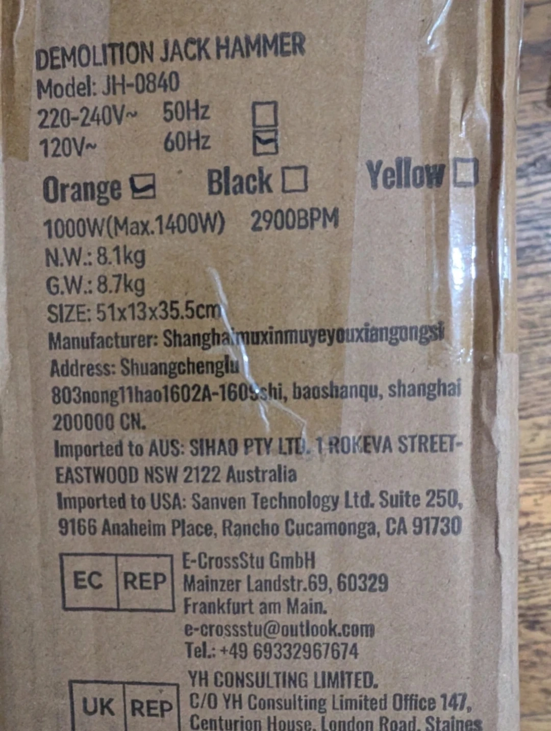 Selling a demolition jack hammer. The model is JH-0840. It operates at 220-240V~ 50Hz and 120V~ 60Hz. It's 1000W (Max.1400W) with 2900BPM. The net weight is 8.1kg, and the gross weight is 8.7kg. The size is 51x13x35.5cm