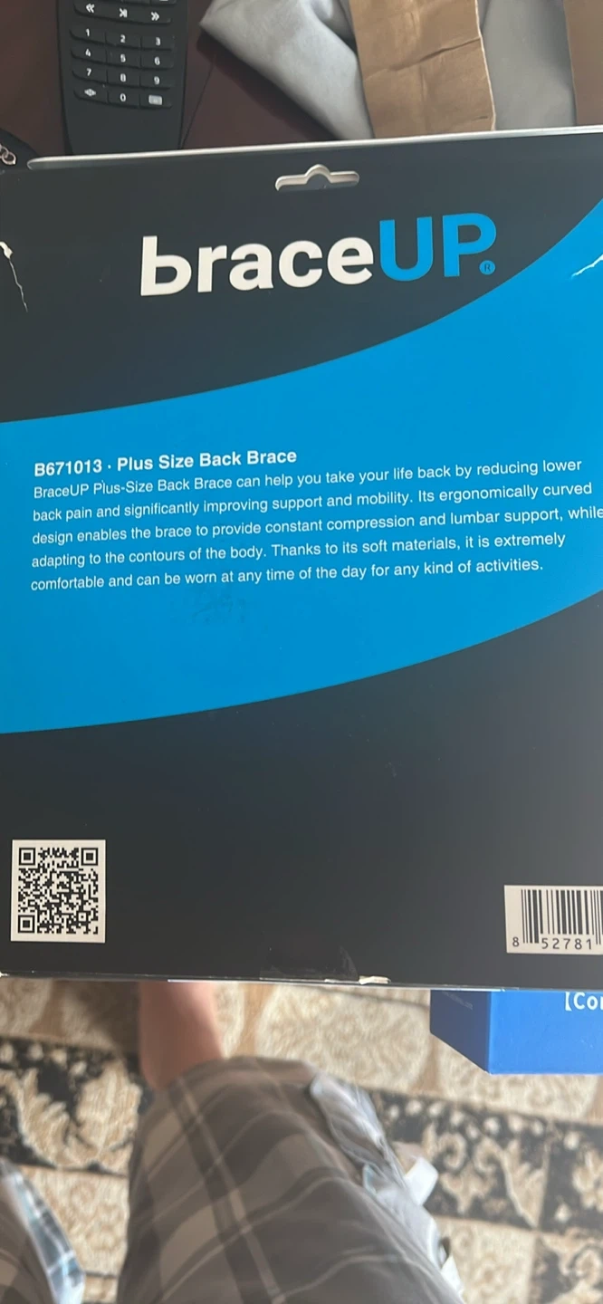 I'm selling a BraceUP Plus Size Back Brace in black, size 5XL. This brace is designed to help reduce lower back pain and improve support and mobility. It's made with soft materials for comfort and can be worn during any activity.