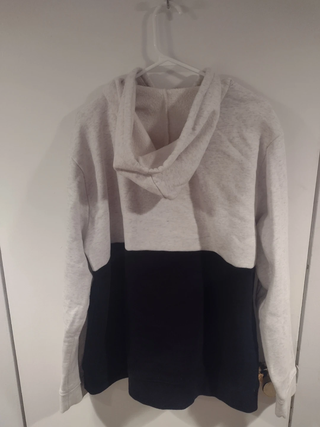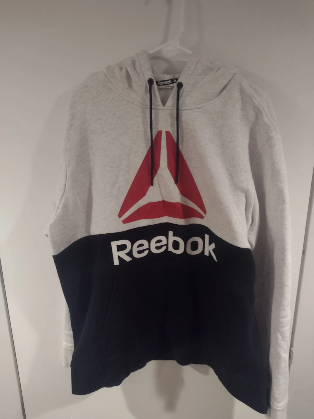 Cozy Reebok hoodie in a stylish grey and black colour block design! Perfect for staying warm on chilly days. It's in great condition and ready for a new home.