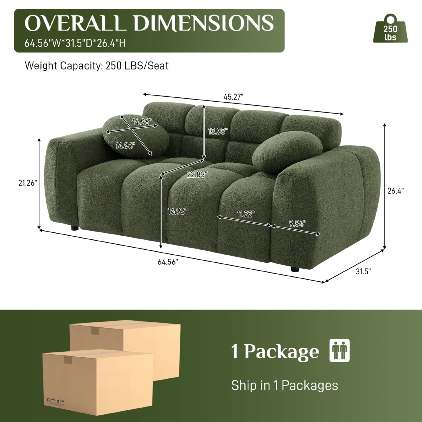 The overall dimensions are 64.56"W x 31.5"D x 26.4"H and has a weight capacity of 250 lbs per seat.