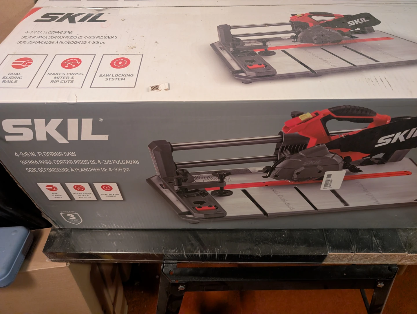 Selling a SKIL 4-3/8 inch flooring saw. It makes cross, miter, and rip cuts. It also has a saw locking system and dual sliding rails.