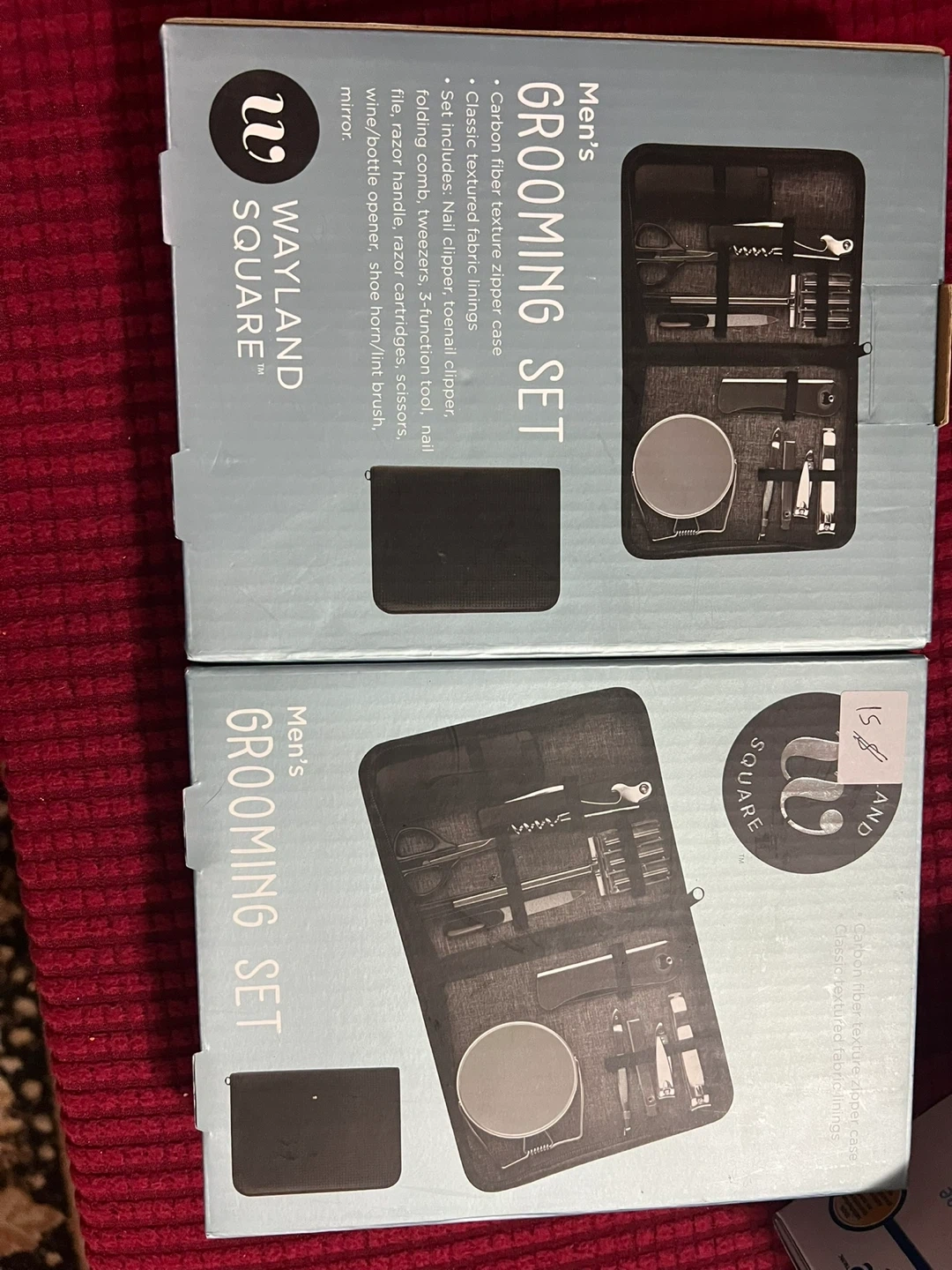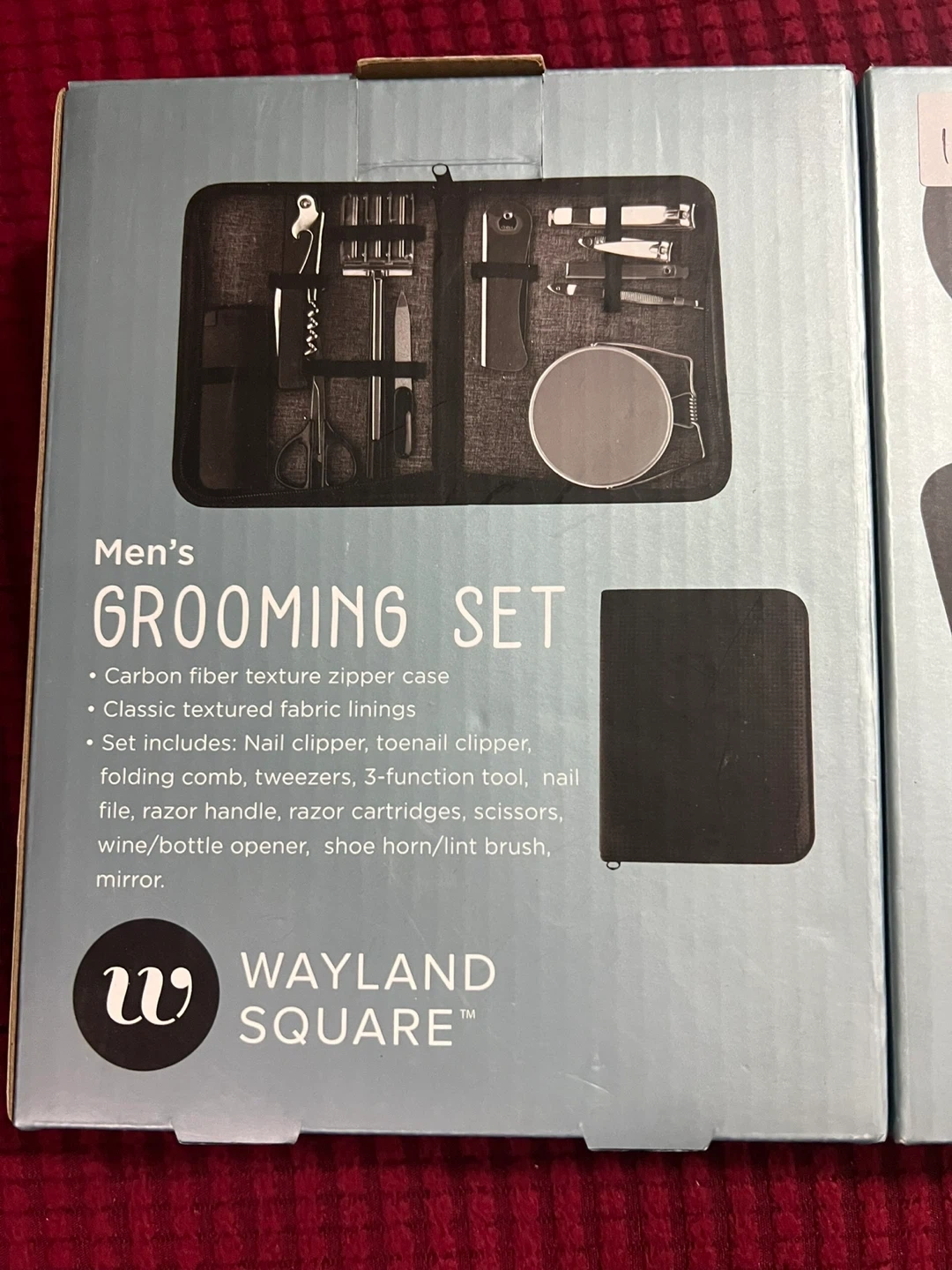 Selling a brand new Wayland Square Men's Grooming Set! It includes a carbon fiber texture zipper case with classic textured fabric linings. The set includes nail clipper, toenail clipper, folding comb, tweezers, 3-function tool, nail file, razor handle, razor cartridges, scissors, wine/bottle opener, shoe horn/lint brush, and a mirror. Perfect for travel or keeping things tidy at home
