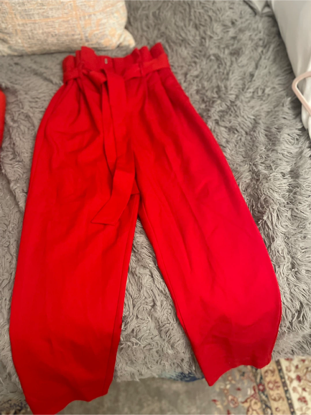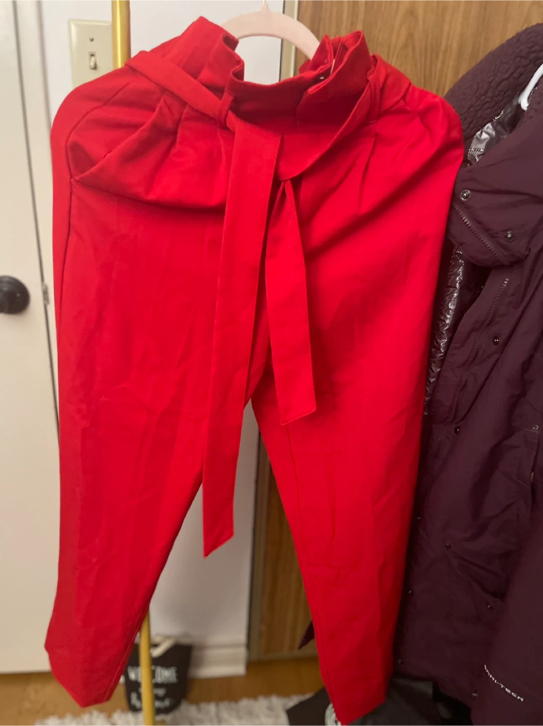 Selling a pair of red high-waisted trousers from H&M. The size is 2 (US) / 34 (EUR). They feature a stylish tie at the waist. The material is a blend of 64% polyester, 32% viscose, and 4% elastane