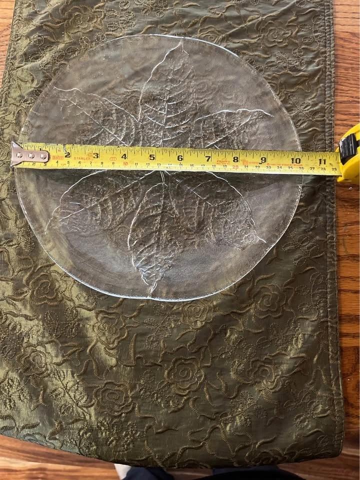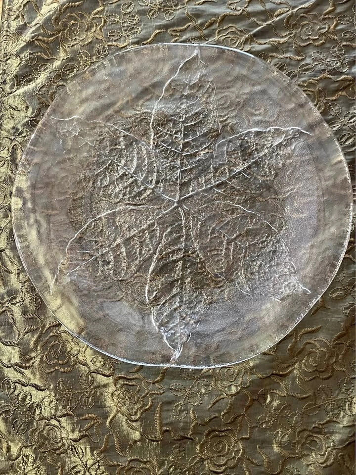 Beautiful decorative glass platter featuring a pressed-leaf design.
