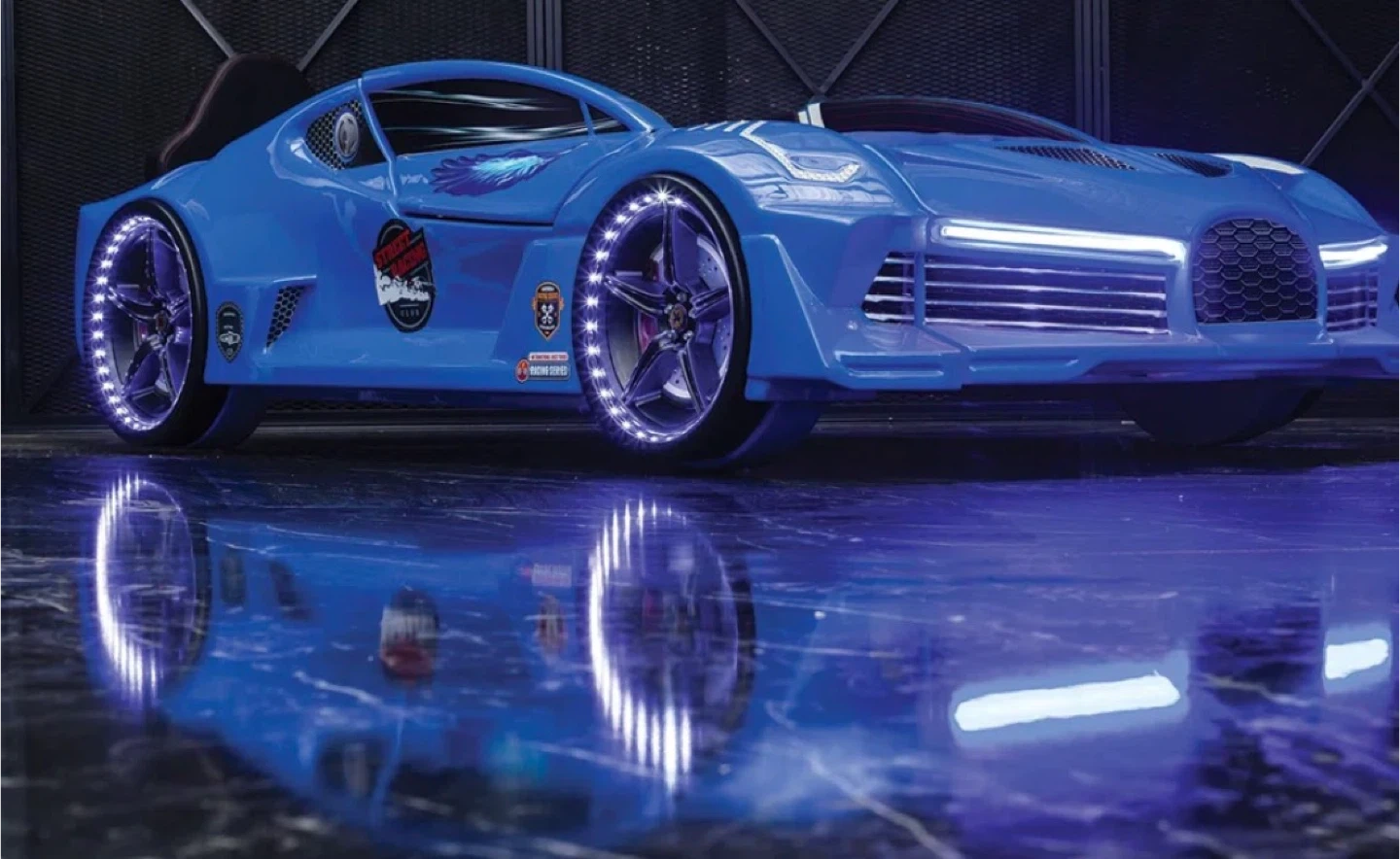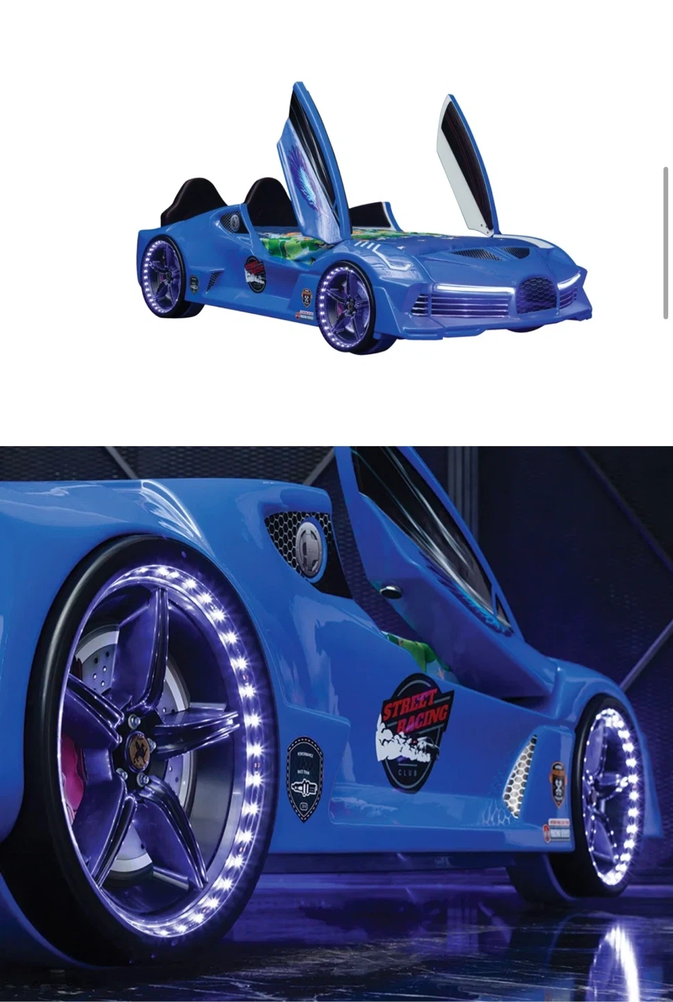 Check out this awesome blue race car bed! It's a twin size and would be perfect for a kid's room. It has really cool LED lights around the wheels and headlights! Brand NEW! Comes with a starter!