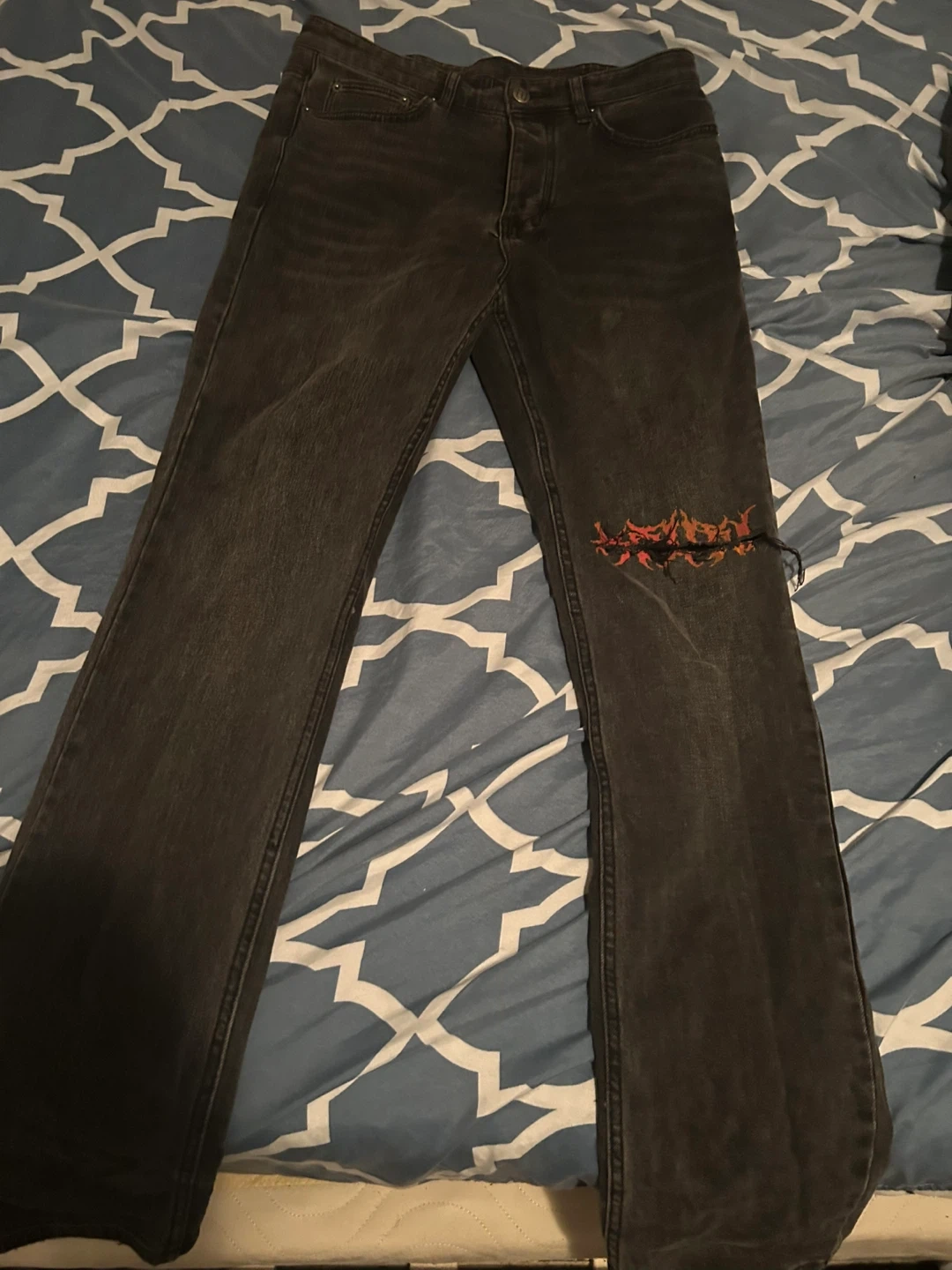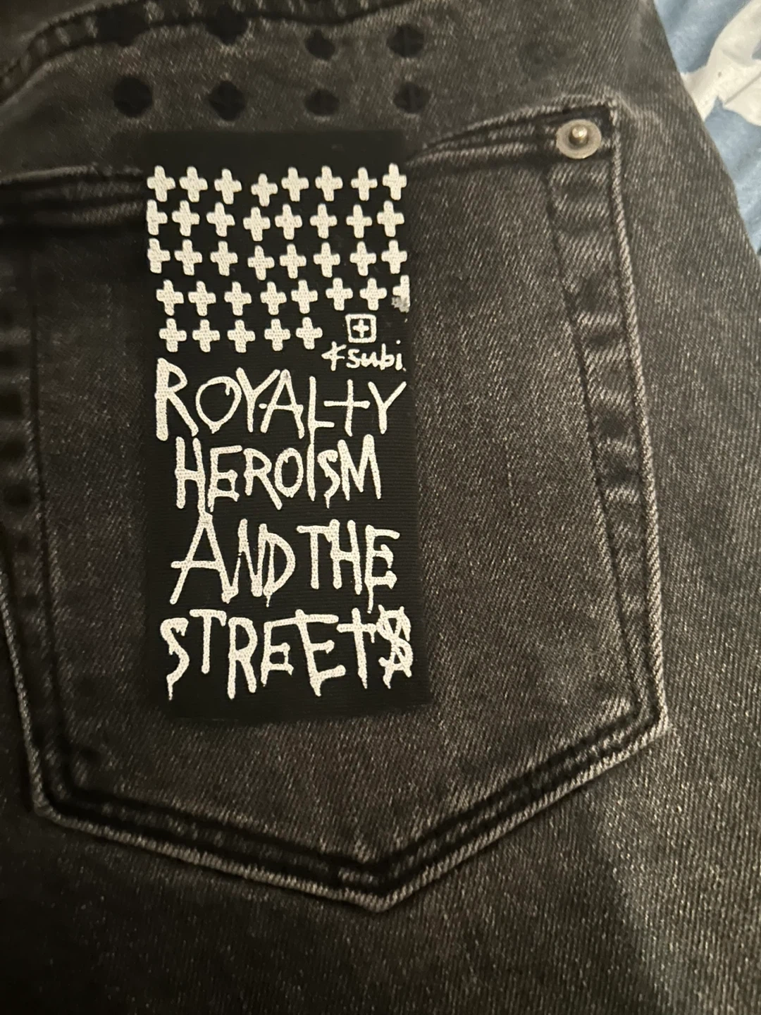 Selling a pair of Ksubi jeans with the "Royalty Heroism And The Streets" design. They are a size 30 and made of 99% cotton and 1% spandex. These jeans are in great condition and ready for a new home!