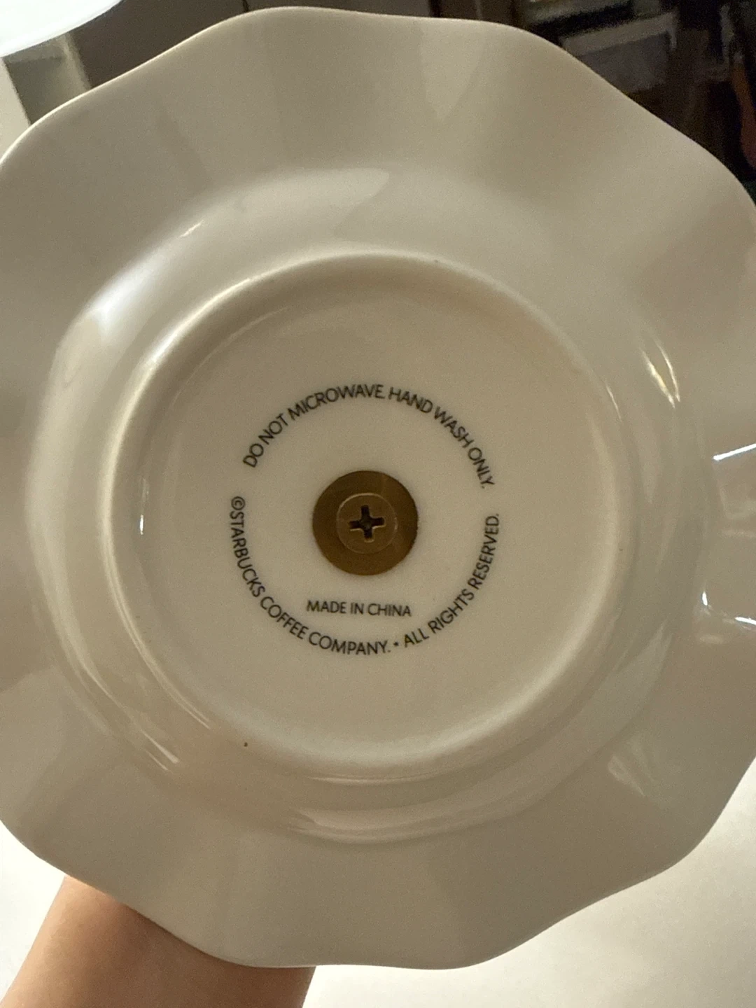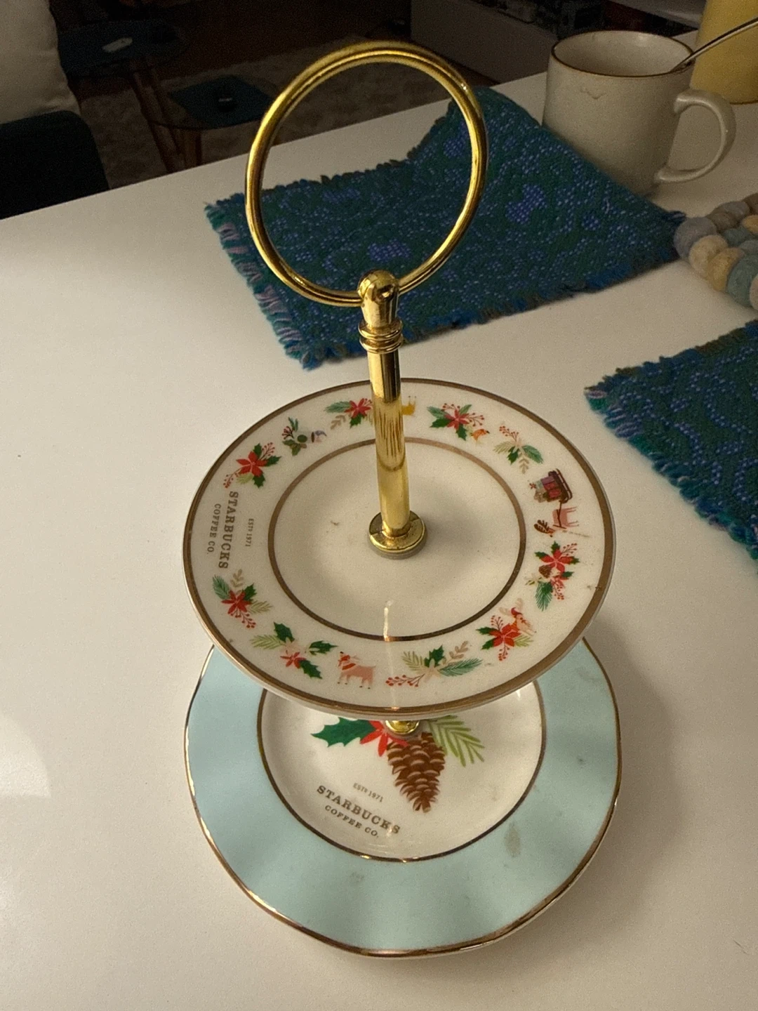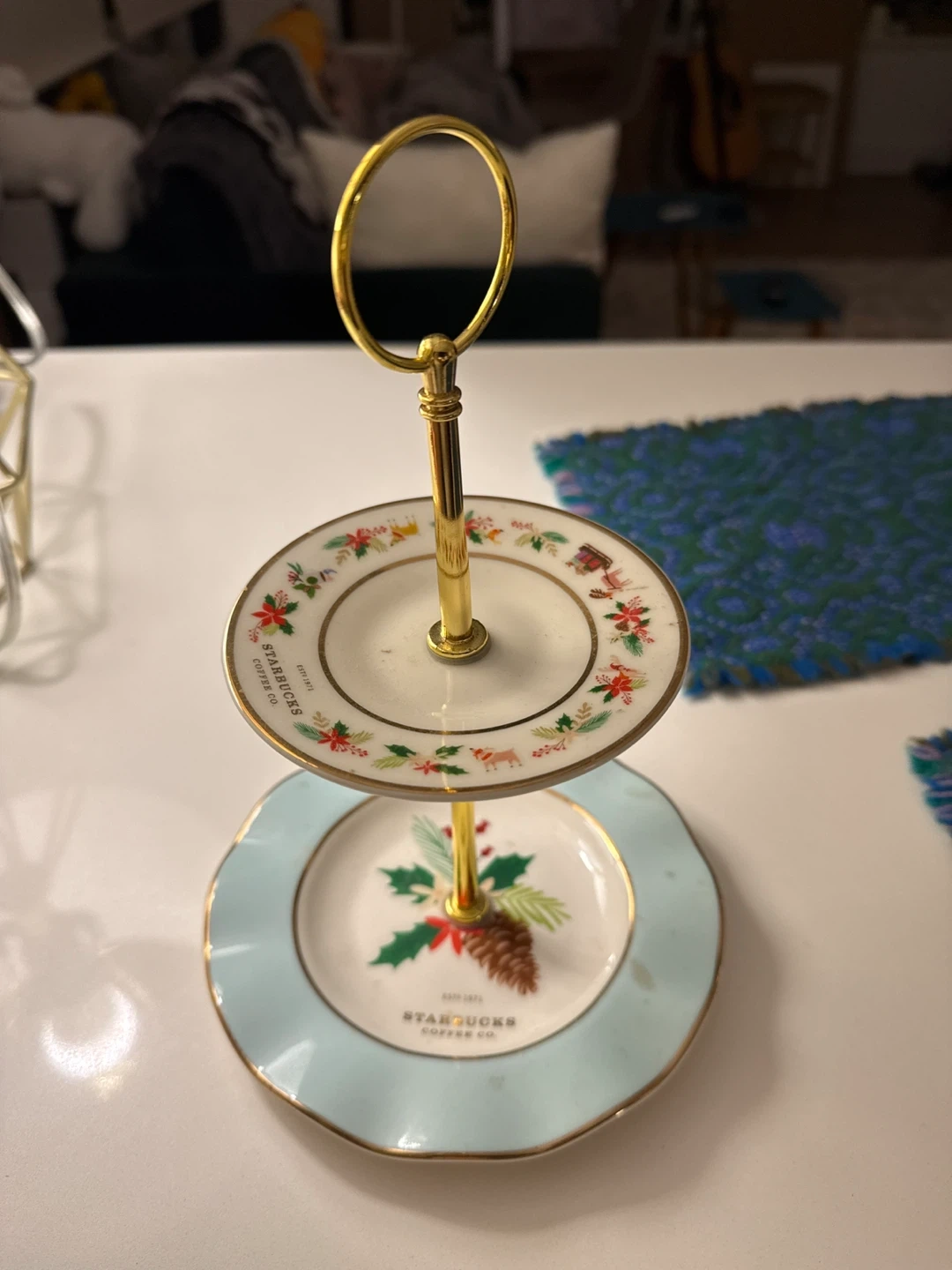 Here's a lovely two-tier dessert stand from Starbucks! It's perfect for displaying treats and adding a touch of elegance to your table. The stand features festive designs and gold accents, making it a great addition to your holiday decor or any special occasion. Hand wash only