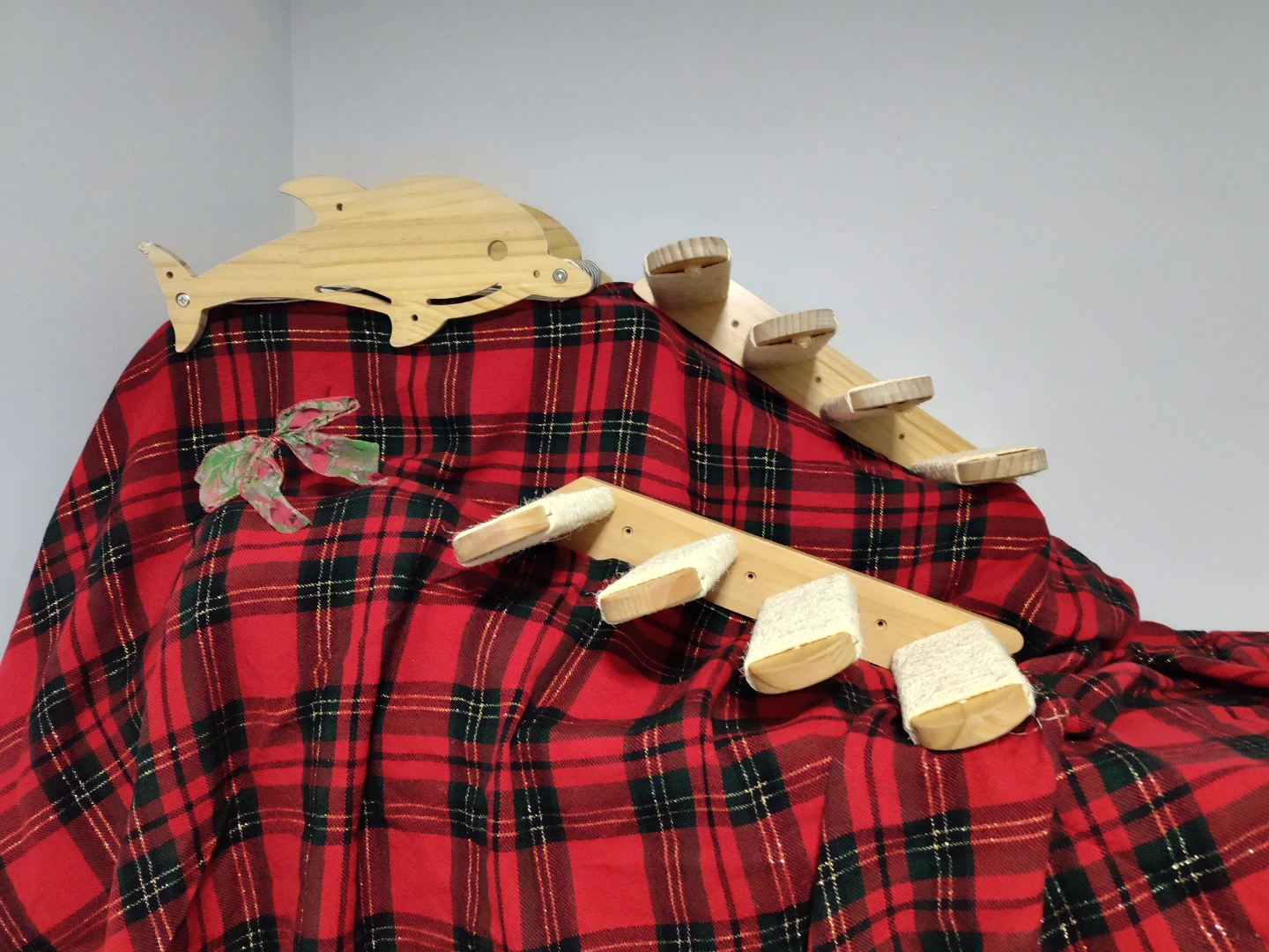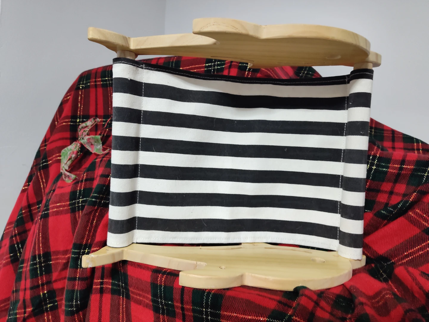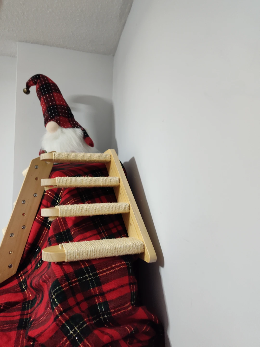 Here's a cute wooden pet hammock with a black and white striped fabric. Also including a wooden cat climbing ladder with rope wrapped steps. Both are in great condition and ready for your furry friends!