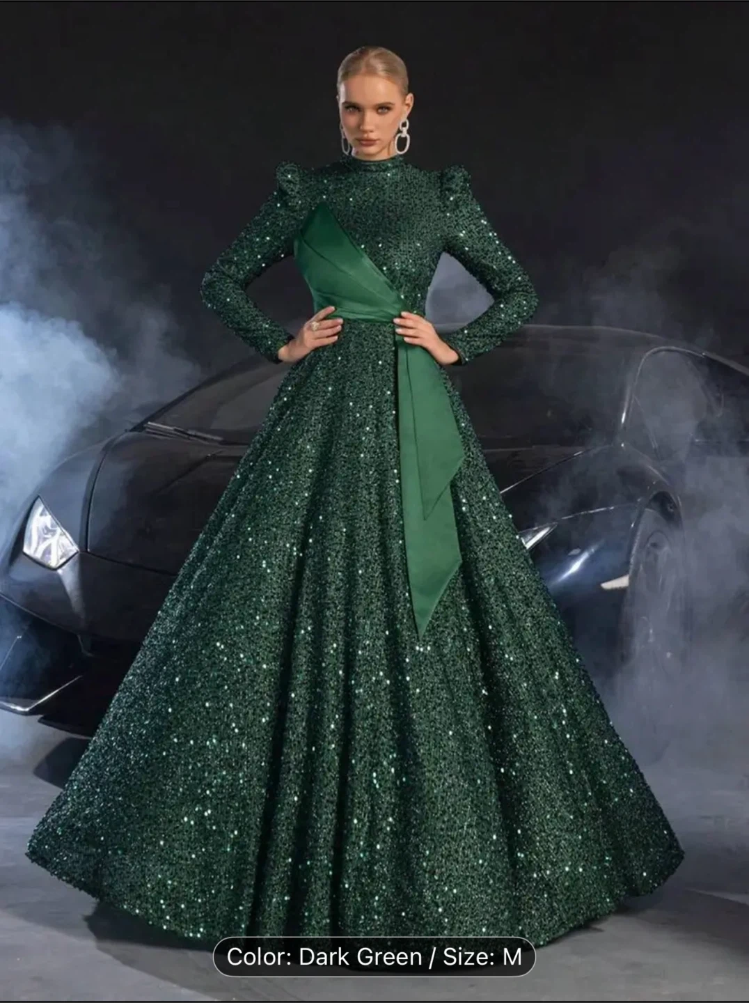 Selling a beautiful dark green sequin maxi dress in size M. It features long sleeves and a stylish sash detail. Perfect for a special occasion!