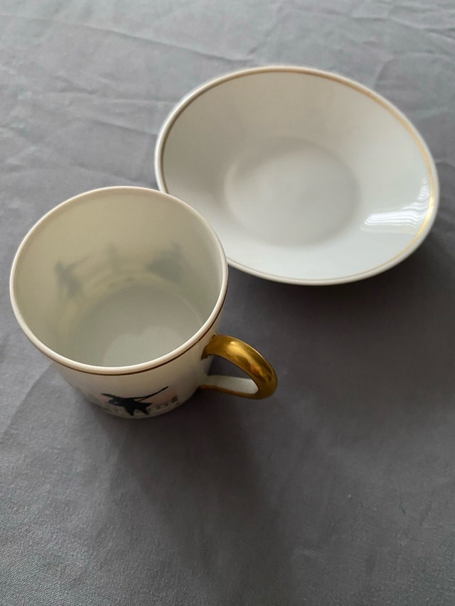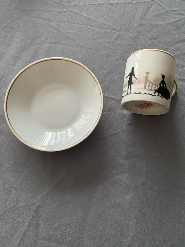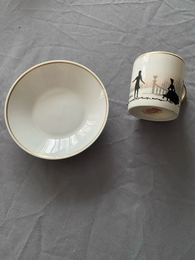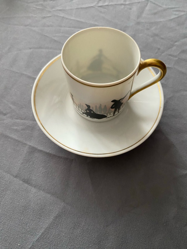 Elevate your tea or coffee experience with this exquisite Limoges porcelain cup and saucer set, showcasing elegant black silhouette scenes and luxurious gold trim; a charming touch for any table setting. This is a used item in good condition.