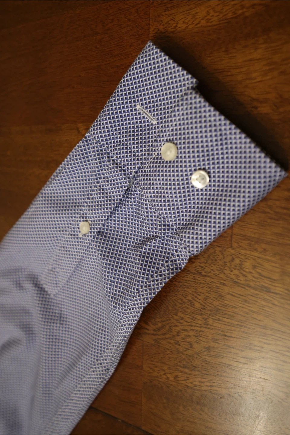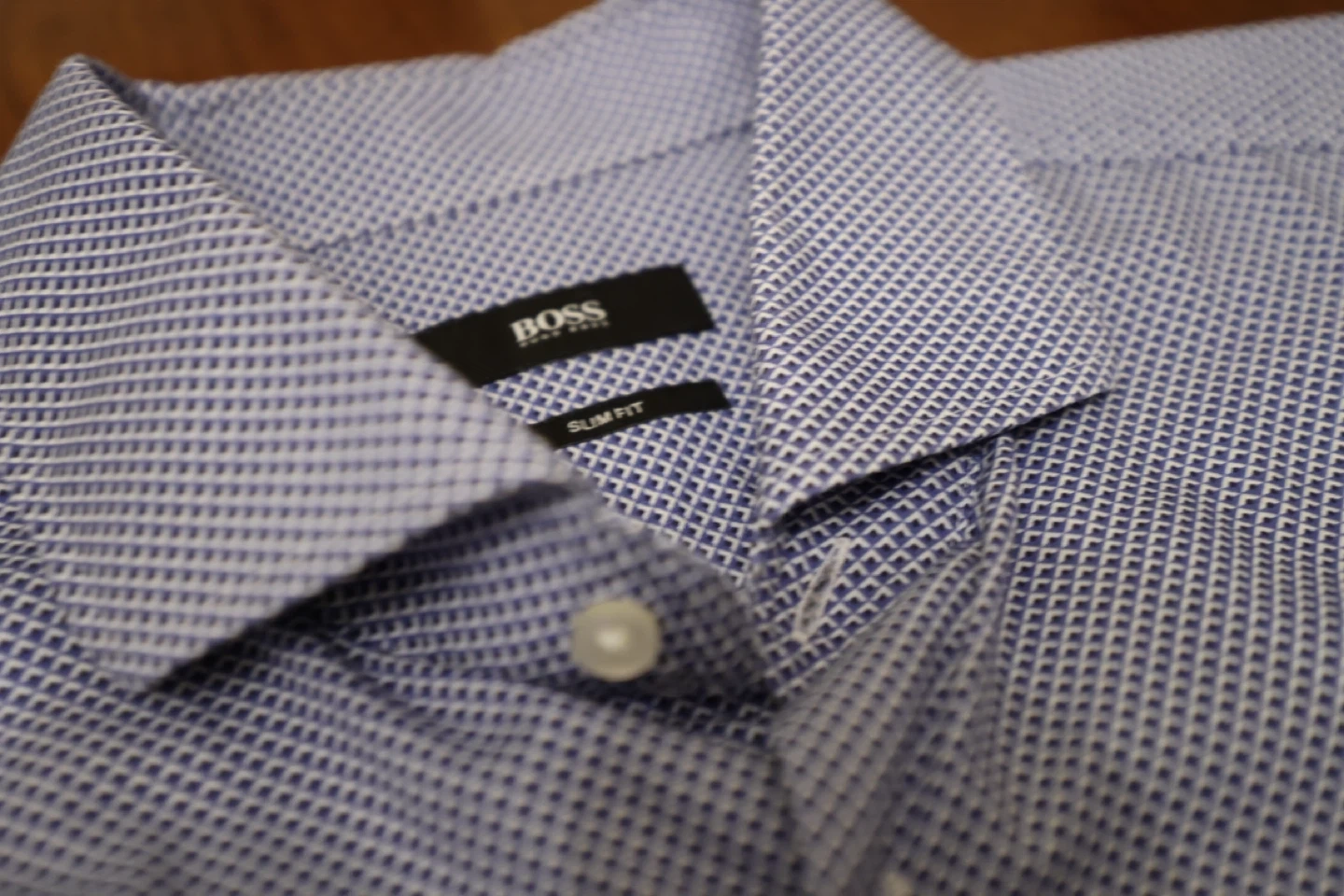 Sophisticated blue dress shirt by Boss. Features a subtle geometric pattern. Ideal for formal and casual settings.