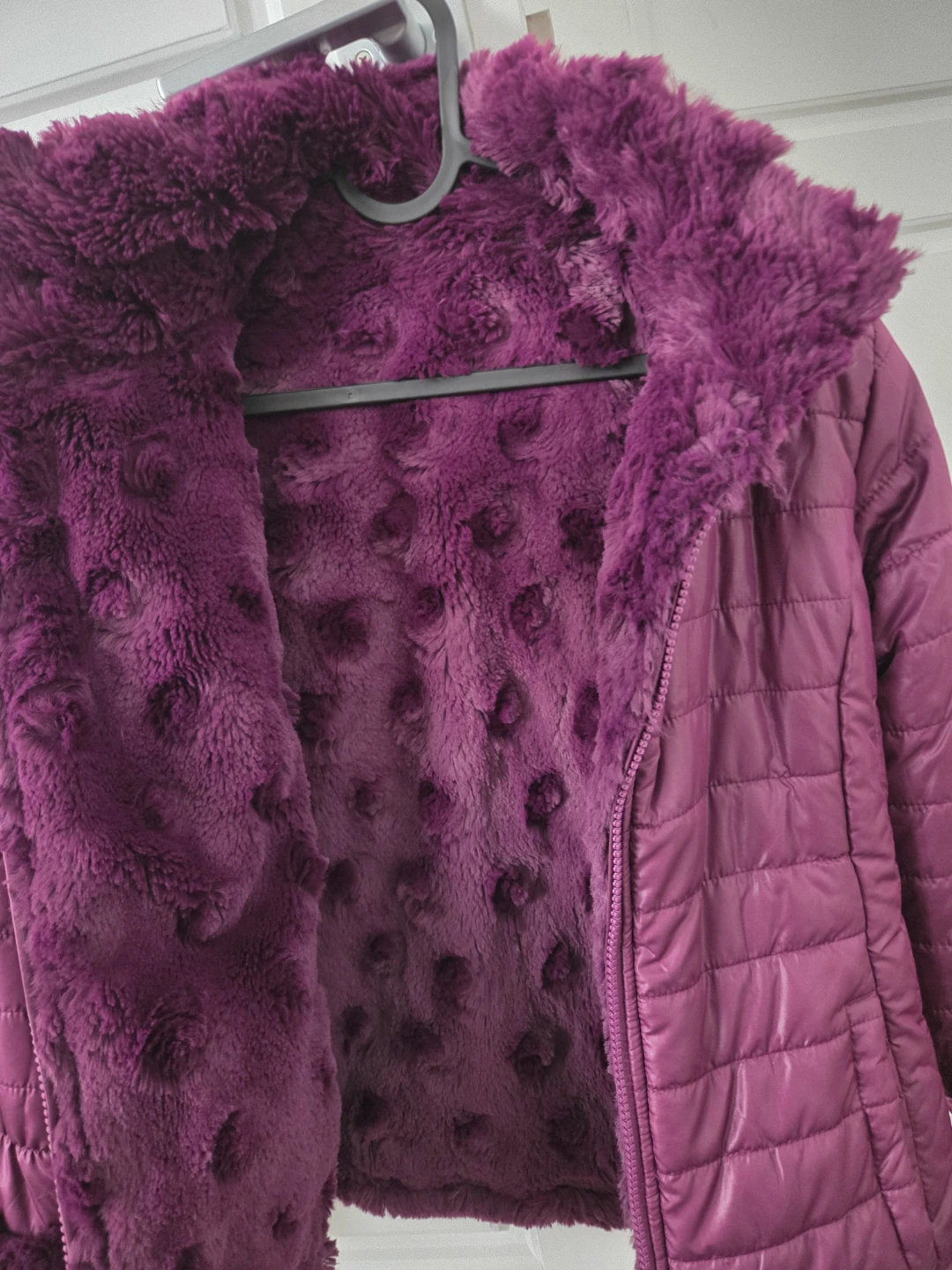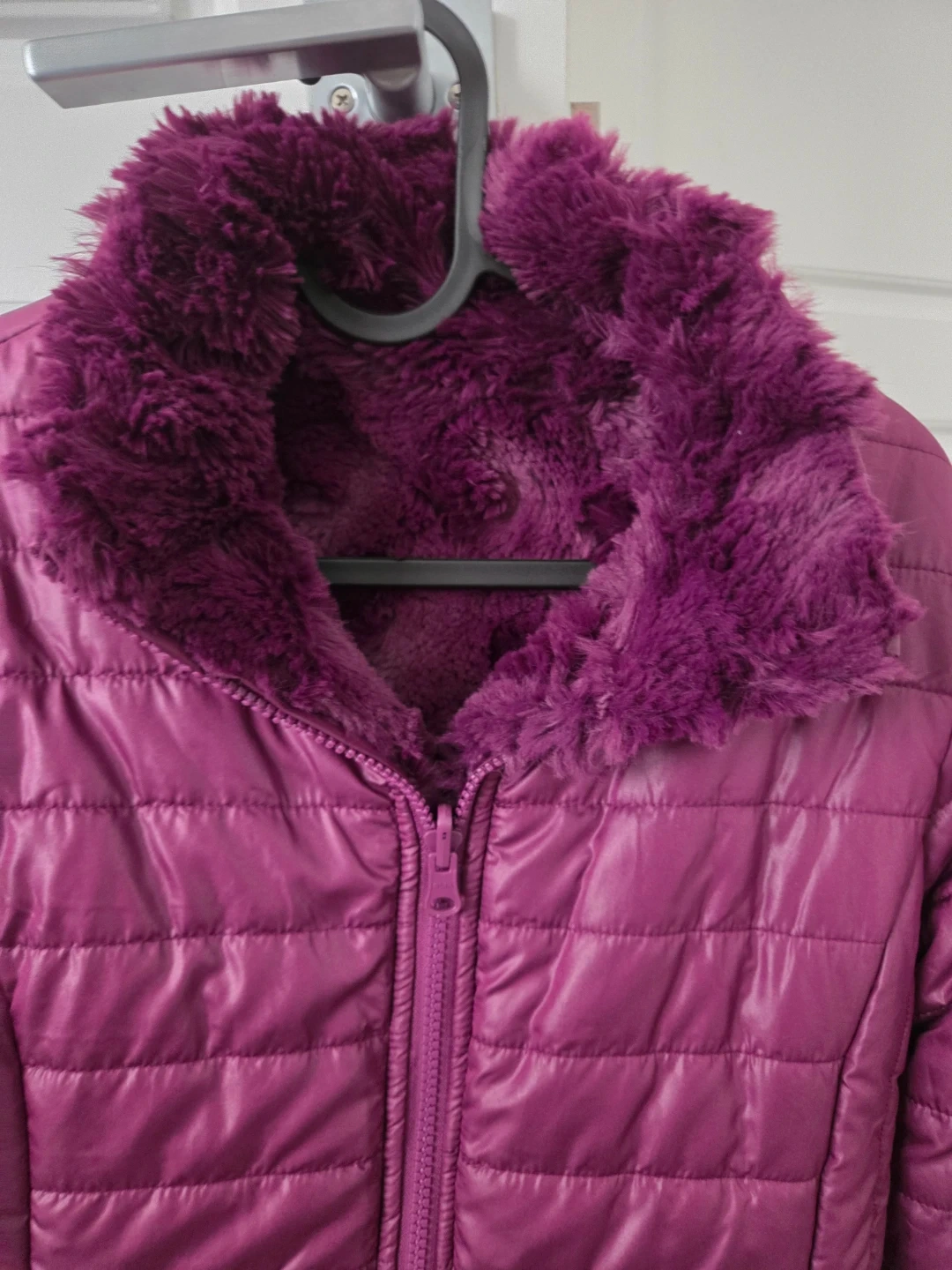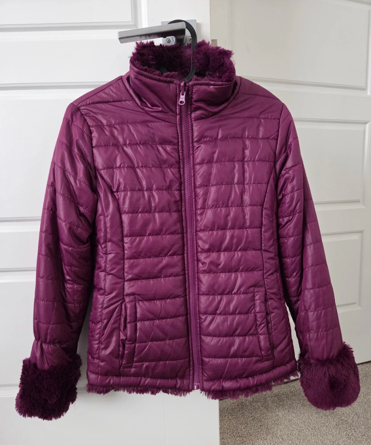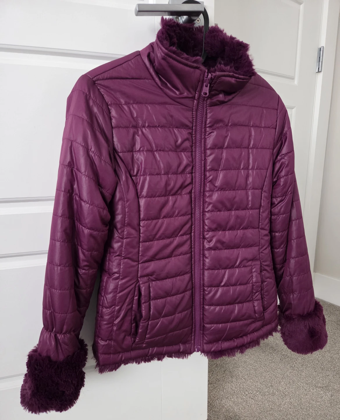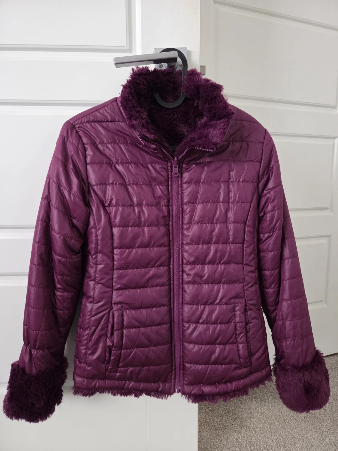 Very warm lovely purple puffer jacket featuring a cozy faux fur trim on the collar and cuffs. The jacket has a quilted design and a full zip closure.