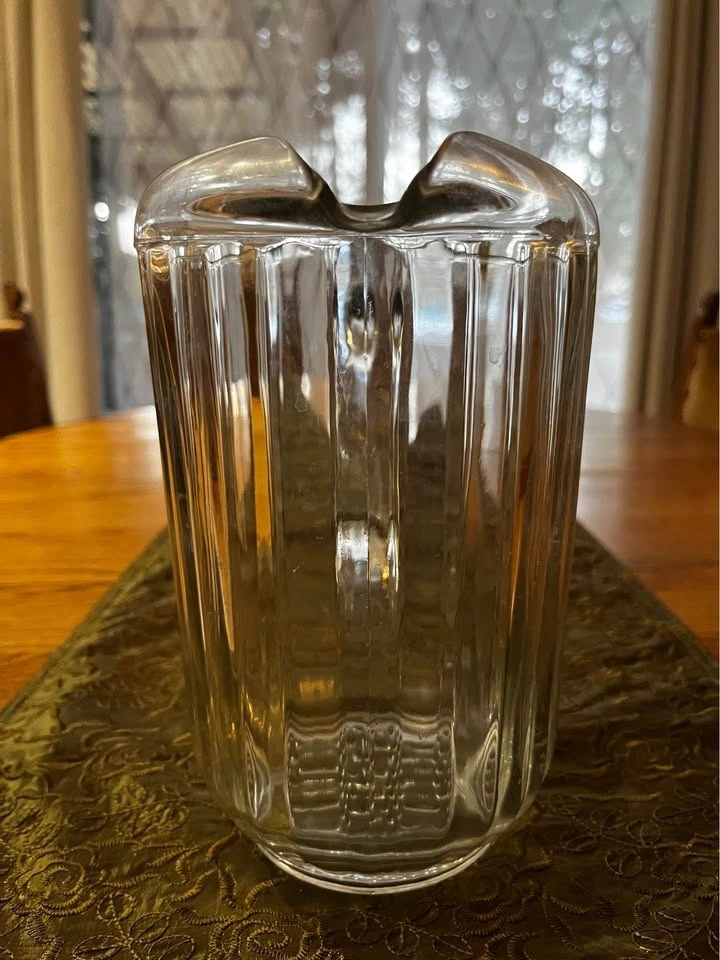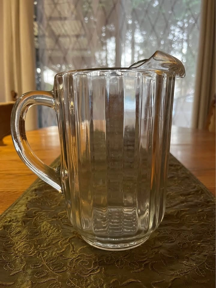 Classic ribbed clear-glass pitcher. Sturdy, heavy-duty design. Wide pour spout and solid handle. Retro pressed-glass base. Great for water, juice, iced tea, sangria, cold brew, or floral arrangements.