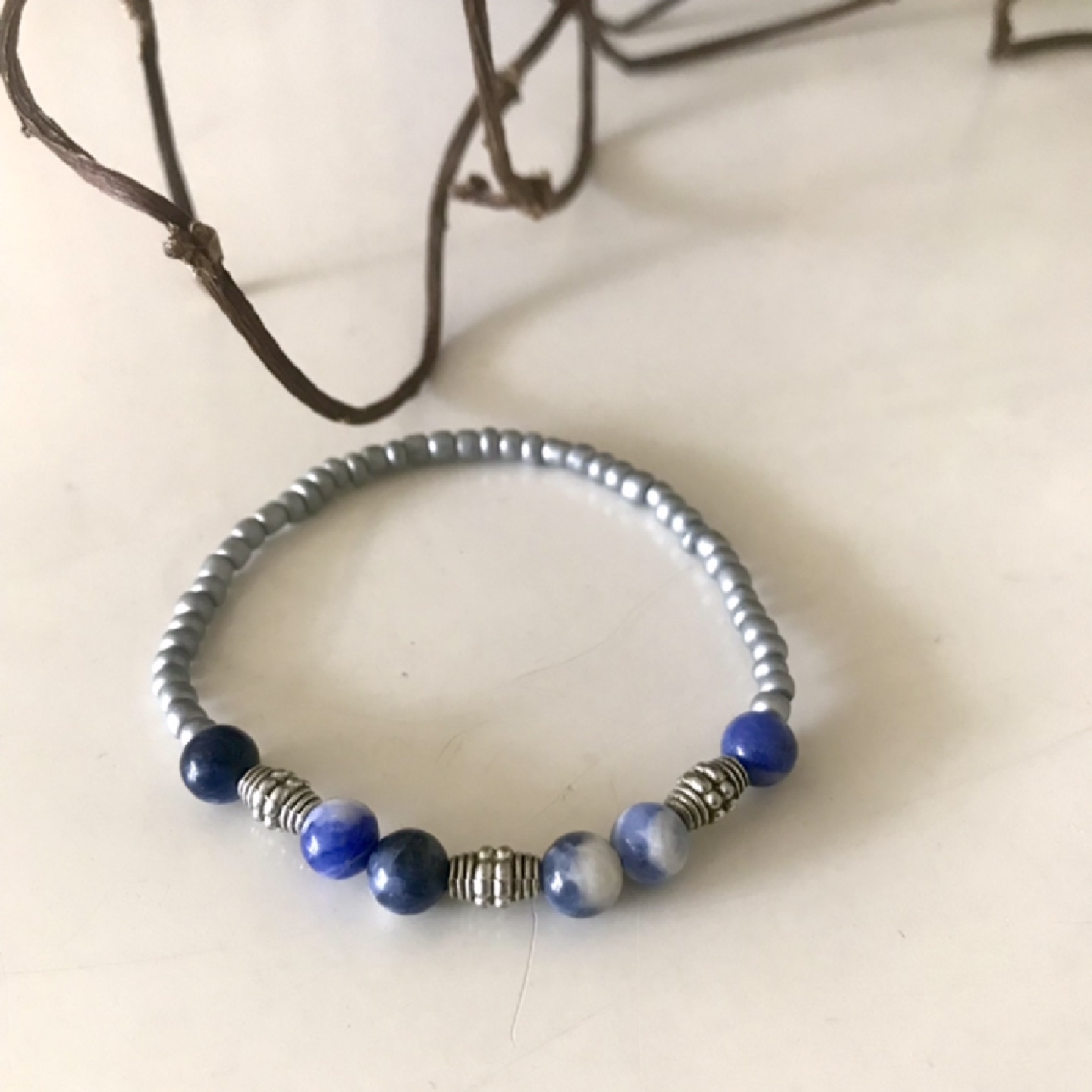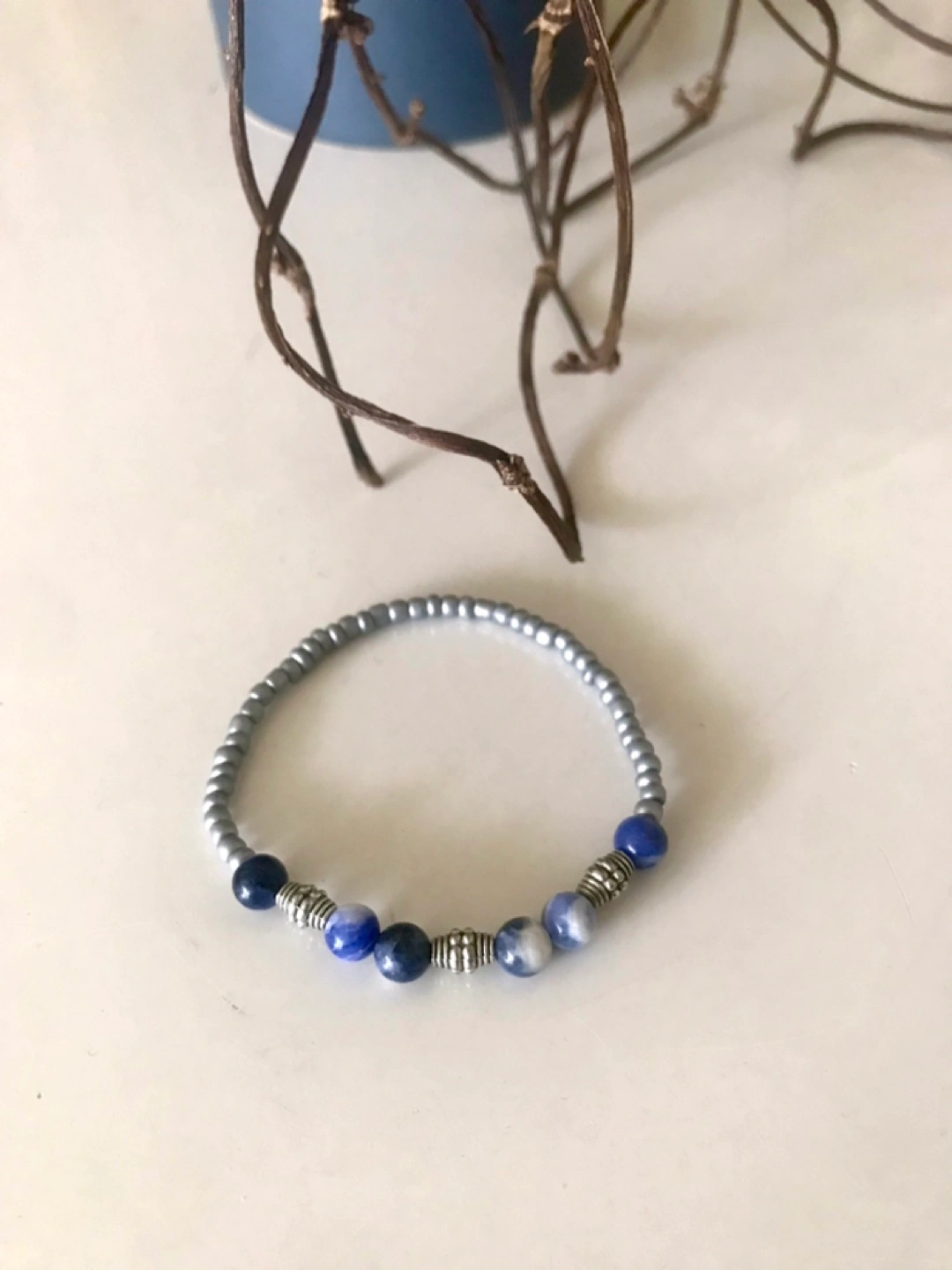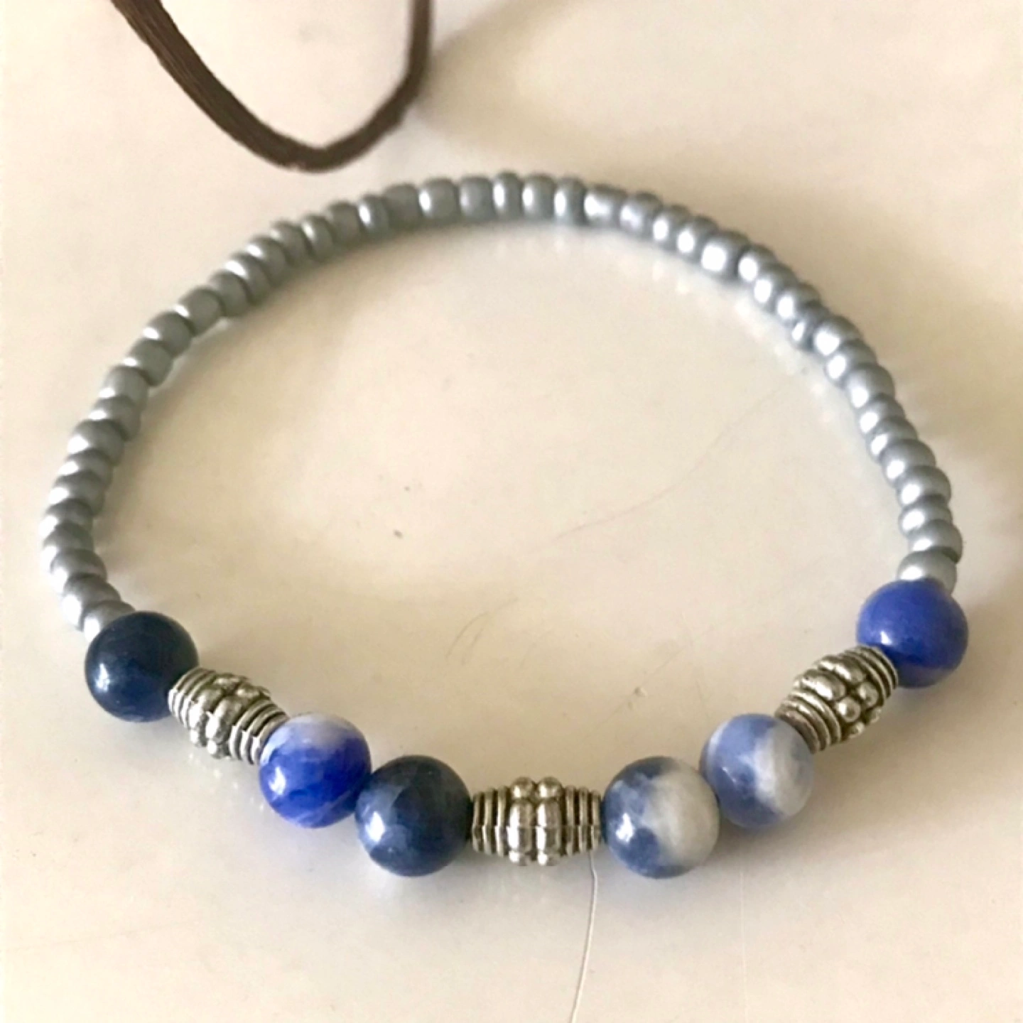 It’s beaded on a stretch elastic band, easy to pull on and off the wrist.