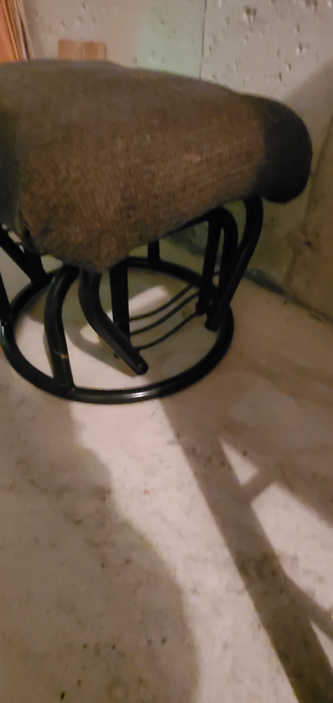 Selling a gently used upholstered swivel stool. It features a black metal frame and a padded seat covered in a textured brown fabric. Perfect as an extra seat or footstool