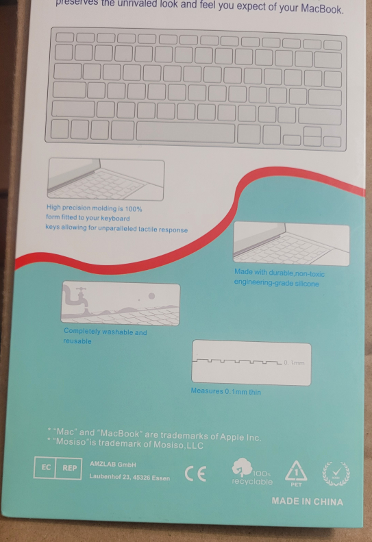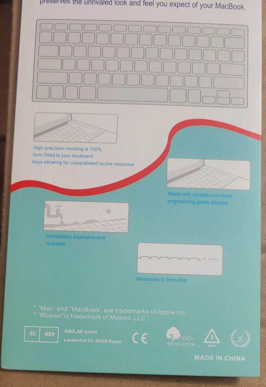 Durable, non-toxic engineering-grade silicone. It's completely washable and reusable. The cover measures 0.1mm thin, and the high-precision molding is 100% form-fitted to your keyboard keys, allowing for unparalleled tactile response.