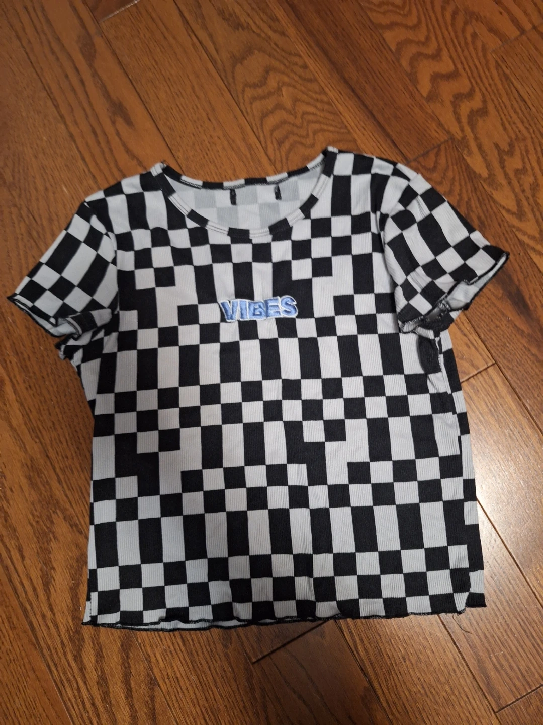 Here's a fun black and white checkered t-shirt! It has the word 'Vibes' stitched on the front. It's in great condition and super stretchy and comfy.. No tag cause they bother me, but its a Medium.